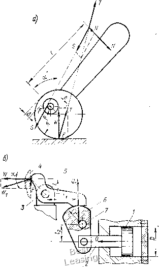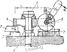 приняв Si =0,2-7-0,4 мм и S2=0,4-0,5 мм, получим формулу для определения эксцентриситета [мм]: е = 8/2+Ж/(2/) + (0,3--0,5). При ограничении угла поворота а/ эксцентрика (а/ значительно меньше 180°) эксцентриситет e = (si + 8 + l )/(l-c(«a0. Радиус R наружной поверхности эксцентрика определяют из условия его самоторможения. Рассмотрев силы, действующие на круглый эксцентрик (см. рис. П1.11), найдем, что равнодействующая сила Т от сил зажима (реакции) W и силы трения F должна быть равна и направлена обратно силе реакции Т со стороны цапфы эксцентрика. Сила реакции Т находится по касательной к кругу трения радиуса q. Из рисунка получим (е-p) ?=smcp, где q-радиус круга трения, мм; ф=6-8-угол трения покоя, град; /?= (е-e)/sin ф, мм. При e<Q где г - радиус цапфы эксцентрика, мм; А - толщина перемычки, мм. Величины q я г определяют из равенства Р=/1г, где/i = 0,12-=-0,15 - коэффициент трения покоя в цапфе эксцентрика. Радиус цапфы эксцентрика можно определить, задаваясь ее шириной Ь: r = \r/(2beJ. При Ь = 2 г Здесь b - ширина эксцентрика в месте сопряжения с цапфой (осью) (выбирают по конструктивным соображениям), мм; Осм= = 14,7-=-19,6 -допустимое напряжение на смятие, МПа (осм=: = 1,54-2 кгс/мм2): Для полусухих поверхностей ф=б4-8°; /=0,184-0,2. Угол поворота эксцентрика, соответствующий наименее выгодному для самоторможения эксцентрика положению. «1 = 90° +ср. ![]() Ширина рабочей части эксцентрика B=0,0l75WE/{RoU, где 15-сила зажима детали Н (кгс); Л = 1,96-10 - модуль упругости материала эксцентрика, МПа {Е = 2-10 кгс/мм); -радиус наружной поверхности эксцентрика, мм; Осм = 5,88-10 -допустимое напряжение на смятие, МПа (кгс/мм); ((Тсм = 60 кгс/мм). Размеры круглого эксцентрика е, г, R я В необходимо принимать с учетом ГОСТ 9061-68, 12189-66. Стандартные круглые эксцентрики (ГОСТ 9061-68) ймеют размеры £) = 324-80 мм и е= = 1,74-3,5 мм. Следовательно, круглые эксцентрики имеют небольшой линейный ход и их не следует применять для зажима деталей, имеющих большой допуск на размеры детали в направлении ее зажима. Достоинство круглых эксцентриков - простота их изготовления; недостатки- изменение угла подъема а и силы зажима W при закреплении обрабатываемых деталей с большими колебаниями размеров в направлении зажима. На рис. П1.12 показан нормализованный эксцентриковый при-Х1ват для зажима деталей. Обрабатываемая деталь 3 установлена на неподвижных опорах 2 и зажата планкой 4 эксцентрикового прихвата. Эксцентрик 6 с планкой 4 после разжима детали 3 перемещается по опоре 7 вправо. Для закрепления детали применяются и криволинейные эксцентриковые зажимы. Криволинейные эксцентрики при сравнении с круглыми имеют следующие преимущества: 1) большой угол поворота эксцентрика (100-150°); 2) более постоянную силу зажима обрабатываемых деталей. Сила зажима обрабатываемой детали эксцентриковым зажимом в 3-4 раза меньше, чем винтовым, при одинаковых длине рукоятки и исходной силе. Чтобы определить зависимость между силой зажима W обрабатываемой детали и моментом на рукоятке эксцентрика после закрепления детали, рассмотрим схему, представленную на рис. П1.13, а. При зажиме обрабатываемой детали эксцентриком на него действуют три силы: сила N на рукоятке, сила реакции Т от Рис. III.12. Нормализованный эксцентриковый прихват: / - гайка; Р -опорные штыри; 5-обрабатываемая деталь; 4 - прижимной прихват; 5 - винт; 6 -эксцентрик; 7 - опора эксцентрика ![]() Рис. III.13. Схема для определения сил, действующих на эксцентрик (а), определение силы 