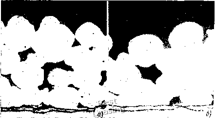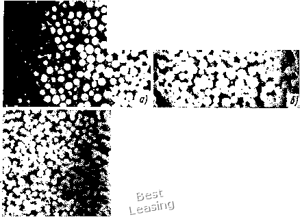 ![]() Рис. 47. Поперечное сечение металлофторопластового материала (микрошлиф X 100) Шарнирные неразборные подшипники на внутренней сферической поверхности наружного кольца имели рабочий антифрикционный слой. Внутреннее кольцо было изготовлено из стали ШХ15, термически обработано до твердости Hi?С 60, а его рабочая поверхность полирована. Испытывавшиеся шарнирные подшипники имели размеры отверстия под болт диаметром 20 мм. Строение материала. Поперечное сечение материала показано на рис. 47. Его структуру можно представить состоящей из четырех слоев. Первый слой, условно называемый приработочным, состоит изфторопласта, наполненного мелкодисперсным (3-7 мкм) дисульфидом молибдена. Содержание дисульфида молибдена по массе составляет 25%, кроме некоторых, специально оговариваемых случаев, когда оно равно 25% по объему, как это имеет место в подшипниках производства Климовского машиностроительного завода. Для некоторых применений, когда трение подшипника должно быть возможно меньшим, а допустимая величина линейного износа достаточно велика, приработочный слой утолщается (б = 0,14-0,2 мм) и становится основным рабочим слоем. Обычно толщина приработочного слоя лежит в пределах 0,01-0,04 мм. Если от подшипника требуется, чтобы он обеспечил повышенное трение уже в самом начале работы, то толщина приработочного слоя выдерживается в пределах 0,05-0,02 мм. Второй, бронзофторопластовый слой представляет собой как бы два вставленных один в другой губчатых слоя бронзы и наполненного фторопласта. Пористый металлический каркас бТЗразо-ван спеканием сферических частиц высокооловянной бронзы. Бронзофторопластовый слой по высоте неоднороден. В нем можно выделить три зоны, различающиеся величиной относительной площади, занимаемой бронзовыми частицами в продольных сечениях. Первая зона характеризуется увеличением этой площади от нуля до наибольшего значения, равного 80%, достигаемого при изнашивании бронзофторопластового слоя на глубину 0,1 мм. Во второй зоне структура бронзофторопластового слоя соответствует наибольшей плотности бронзовых частиц. Наконец, в- третьей зоне бронзофторопластового слоя (зона соединения с основой) относительная площадь, занимаемая бронзовыми частицами, уменьшается до некоторого минимального значения (рис. 48). Третий, меднооловянный слой, имеет толщину порядка 0,015- 0,02 мм. Этот слой обеспечивает прочное сцепление бронзового 118 . ![]() Рис. 48. Изменение структуры материала по высоте (косой шлиф под углом 0,001; Х40): а - первая зона; б - вторая зона; в - третья зона пористого слоя, со стальной основой, которая является четвертым слоем. Стальная основа образуется сталью 20, а ее толщина находится в пределах 1-4 мм. Прочность и деформационные характеристики материала. Прочностные и деформационные характеристики металлофторопластового материала исследовали на образцах и натурных подшипниках в процессе действия на них близких к предельным статических и максимально возможных в эксплуатации вибрационных нагрузок. Изучали изменение структуры бронзового каркаса, а также определяли упругие и остаточные деформации материала при статическом сжатии металлофторопластовых шайб, имеющих рабочую поверхность на обеих сторонах, между твердыми параллельными плитами. Шайбы размерами Dx-dxh - 35x24,1x1,8 мм, нагружали на установках типа ЦДМУ-10т и ЦДМ-200т (и
