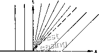 мая задача похожа на задачу о распространении центрированной волны разрежения в течении сжимаемой жидкости. В случае уравнения Бюргерса волна разрежения ограничена слева линией л: = О, а справа - проходящей через начало координат характеристикой, которая изображена на рисунке штриховой ли- Рис. 4.25. Начальные условия дли волны разрежения. иней. Математически решение задачи о распространении волны разрежения можно записать в виде м = 0, а:<0, u = x/t, 0<x<i, u=l xt. Итак, заданное начальное распределение и приводит к образованию центрированной волны разрежения, ширина которой растет по времени линейно. Мы изучили две задачи, часто встречающиеся в сверхзвуковых газодинамических течениях-ударные волны и волны разрежения, - которые можно моделировать при помощи уравнения Бюргерса. Решения такого типа существуют и для других нелинейных гиперболических уравнений в ча- ![]() Рис. 4.26. Характеристики для случая центрированной волны разрежения. стных производных. Вооружившись простыми аналитическими решениями для двух этих важных случаев, перейдем к изучению различных разностных схем решения невязкого уравнения Бюргерса. 4.4.1. Метод Лакса Схемы первого порядка точности почти не используются для решения гиперболических уравнений в частных производных. Метод Лакса [Lax, 1954] выбран как типичный метод первого dt дх Применим метод Лакса. Для этого выпишем первые два члена ряда Тейлора для функции и в точке (х, t): и{х, t + At) = u{x, + При помощи исходного уравнения заменим производную по времени; тогда запишем и{х, t + At) = u{x, )д() д .... Следуя методу Лакса, для аппроксимации производной используем центральные разности, а первое слагаемое в правой части представим как среднее арифметическое значение в двух соседних узлах (см. п. 4,1.3). В результате получим »„.."ж + "/- 1ж;/-.. (4.139) Для уравнения Бюргерса F=u/2. Коэффициент перехода в этом случае запишется в виде G = cos р - / Л sin р, (4.140) где якобиан А = df/du для уравнения Бюргерса равен просто и. Условие устойчивости схемы Лакса имеет вид <1, (4Л41) так как итгх - максимальное собственное значение матрицы Л, состоящей лишь из одного элемента и. Результаты расчета методом Лакса движущегося вправо разрыва 1-0 приведены на рис. 4.27. Положение движущегося разрыва определяется довольно точно, однако диссипативные свойства метода проявляются в размазывании разрыва на несколько шагов разностной сетки. Как уже отмечалось раньше, это размазывание должно быть тем больше, чем меньше число Куранта. Интересно заметить, что при расчете разрывных ре- порядка точности для того, чтобы показать, что такие методы позволяют решать нелинейные уравнения, но обладают сильными диссипативными свойствами. Для построения разностной схемы, как и при построении всех последующих примеров, воспользуемся дивергентной формой записи исходного уравнения "+ = 0. шений метод Лакса приводит к одинаковым значениям и в двух соседних узлах, как показано на рисунке. Укажем еще на одно свойство метода Лакса - его монотонность, т. е. на отсутствие осцилляции решения. С. К. Годунов [1959] показал, что схемы с более высоким, чем первый, порядком точности не могут быть монотонными Если расчет разрыва является лишь частью более общей задачи, то желательно проводить его, используя мо- и = 1 ~о-:го=югс>-я- ---jQg решение -о- At/Дх = 0.6 -СН At/Ax = 1.0 ![]() Рис. 4.27. Результаты численного решения уравнения Бюргерса по