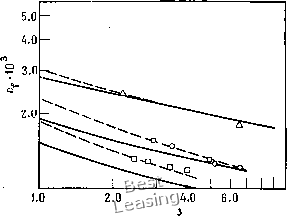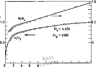 татов оказывается плохим. Учитывая неопределенность, связанную как с измерениями при экспериментальном исследовании, так и с моделью турбулентности, отличие рассчитанных и измеренных значений в пределах -t (3 -f- 4) % обычно рассматривают в случае турбулентных течений как вполне хорошее. Даже простая алгебраическая модель турбулентности позволяет при расчете получать хорошие результаты в широком диапазоне чисел Маха, если рассматриваются турбулентные пограничные слои при нулевом или небольшом градиенте давления. ![]() 10 12 14 16 18 20 Рис. 7.8. Сопоставление результатов расчета пограничного слоя сжимаемого газа на плоской пластине с экспериментальными данными Коулза [Coles, 1953]. Сплошной линией показаны результаты расчета методом Дюфорта - Франкела [Pletcher, 1970]; О данные Коулза (тест 22); с/=0.00122 (эксперимент), с/=0.00119 (расчет). На рис. 7.8 проведено сопоставление рассчитанного методом Дюфорта - Франкела и измеренного Коулзом [Coles, 1953] турбулентного пограничного слоя на теплоизолированной пластине при числе Маха набегающего потока Мв=4.554. Согласование результатов вполне хорошее. Конечно-разностные методы легко приспосабливаются для расчета течений со ступенчато изменяющимися граничными условиями, т. е. для таких условий течения, когда применение простых критериальных зависимостей менее всего обосновано. На рис. 7.9 результаты расчета методом Дюфорта - Франкела при использовании алгебраической модели турбулентности сопоставлены с измерениями Моретти и Кейза [Moretti, Kays, 1965] ДЛЯ случая обтекания низкоскоростным потоком охлаждаемой пластины со ступенчатым изменением температуры при благоприятном градиенте давления. Построенное на рис. 7.9 число 50- 0.004 0.003 0.002 0.001 15 Ь" 5 ![]() i I i i I ( I I I I М I I I I I ![]() i i i i i i i i I i i i i i i I I i 7, =309.4 К р>-> I I I I I I I I i,j.-j .Ljli -....ll- .j. о 1.0 Рис. 7.9. Пограничный слой на охлаждаемой пластине в ускоряющемся потоке, экспериментально исследованный Моретти и Кэйзом [Moretti, Kays, 1965]. Сплошными линиями показаны результаты расчета пограничного слоя методом Дюфорта - Франкела [Pletcher, 1970]; О данные Моретти и Кэйза (тест 22). Стантона St определяется соотношением Si = k {dT/dy)J[PeUe {Наг. - Я,)], где Haw - полная энтальпия на стенке при адиабатических граничных условиях. Из научно-технической литературы известно довольно много примеров, когда проведенные с использованием простейших алгебраических моделей расчеты плохо согласуются с экспериментальными данными. В гл. 5 мы уже приводили примеры, по- казывающие, что некоторые эффекты плохо описываются простейшими моделями турбулентности. К ним относятся течения с низкими числами Рейнольдса, особенно при сверхзвуковых числах Маха. Эффекты, связанные с низкими значениями числа Рейнольдса, проиллюстрированы на рис. 7.10. Из представленных на нем данных видно, что точка,, в которой простейшая ![]() 8.0 10.0 Рис. 7.10.Сопоставление рассчитанных значений коэффициента трения с измеренными Коулзом [Coles, 1953] и Коркеги [Korkegi, 1956] для сжимаемого турбулентного пограничного слоя на пластине при низких числах Рейнольдса: Л данные Коулза, Me = 2.6; О данные Коулза, Ме = 4.5, □ данные Коркеги, Me = 5.8,"-расчет по модели А,-----расчет по модели В. алгебраическая модель турбулентности (модель А) перестает удовлетворительно описывать течение, смещается в область все больших и больших чисел Рейнольдса при увеличении числа Маха основного потока. Кезультаты расчетов с 