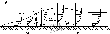 См. также работы В. В. Сычёва, В. Я. Нейланда, Л. В. Гогиша и Г. Ю. Степанова, приведенные в дополнительном списке литературы (стр. 7\2). -Прим. ред. 7.4.2. Замечания о возможности применения уравнений пограничного слоя для расчета отрывных течений Еще совсем недавно предполагалось, что теория пограничного слоя становится несправедливой при приближении к точке отрыва. Это связано с двумя причинами. Во-первых, при стандартной постановке задачи пограничного слоя в точке отрыва возникает широко известная особенность Гольдштейна [Goldstein, 1948]. Во-вторых, сомнительным является использование приближения пограничного слоя в тех случаях, когда его толщина и нормальная составляющая скорости оказываются большими (по отношению к и), чем они обычно бывают при высоких числах Рейнольдса. Теперь мы знаем, что решение обратной задачи в точке отрыва регулярно [Klineberg, Steger, 1974], а результаты ряда расчетов [Wi liams, 1977; Kwon, Pletcher, 1979] показали, что приближение пограничного слоя может оказаться полезным при описании течений, содержащих небольшие замкнутые отрывные зоны (отрывные пузыри). Возможность применения приближения пограничного слоя подтверждает и то, что при возникновении отрывного пузыря толщина пограничного слоя обычно не возрастает на порядок, а значит, используемая в приближении пограничного слоя оценка его толщины 8/L 1 остается справедливой. Результаты, полученные с помощью «трехпалубной модели» вязкого течения [Lighthill, 1953; Stewartson, 1974] ) (см. п. 7.4.4), также показывают, что при больших числах Рейнольдса приближение пограничного слоя справедливо для течений с малыми отрывными зонами. С другой стороны, иногда наблюдаются локальные большие значения производной d8/dXy что должно приводить к большим значениям отношения v/u. Итак, в лучшем случае можно ожидать, что уравнения пограничного слоя являются лишь грубым приближением для течений с рециркуляционными зонами, хотя они и позволяют оценить большинство параметров таких течений с достаточной для многих приложений точностью. Вопрос о том, в каких случаях уравнения пограничного слоя допустимо использовать для расчета отрывных течений, в настоящее время еще изучается. Если используются обычные уравнения пограничного слоя со стандартными граничными условиями, то при наличии отрывных зон прямой расчет пограничного слоя маршевым методом нельзя проводить по двум причинам: во-первых, из-за особенности Гольдштейна в точке отрыва, и, во-вторых, из-за наличия ![]() Рис. 7.11. Течение с отрывным пузырем; стрелками указано направление потока. пограничного слоя с заданным Ue{x) эта особенность проявляется как тенденция к неограниченному росту v при уменьшении шага сетки в продольном направлении. Для течения Хоуарта с линейным изменением скорости [Но-warth, 1938] такое поведение решения проиллюстрировано на рис. 7.12. Естественно, что если шаг сетки конечен, то и конечно, но получающееся при этом решение не единственно. Преодолеть такое особое поведение решения, которое является скорее математической особенностью уравнений, чем физической особенностью течения, можно, либо вводя при использовании прямых методов поправку к давлению, связанную с взаимодействием [Reyhner, Fliigge-Lotz, 1968; Napolitano et al., 1978], либо используя обратные методы. В этом разделе мы рассмотрим лишь обратные методы, применение которых не связано с привлечением дополнительн