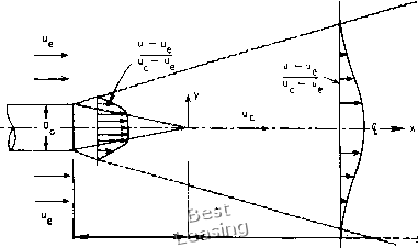 § 7.6. Свободные сДвнгойые течений ные условия выполнены, то для описания рассматриваемого течения можно воспользоваться уравнениями тонкого вязкого слоя (5.116) -(5.119). Выпишем эти уравнения для простейшего случая течения несжимаемой жидкости в круглой струе при отсутствии градиента давления. Уравнение неразрывности д{уи) д(уу) дх ду Уравнение движения ди . ди \ д V f ди ~7~7м (7.106) (7.107) При численном решении основное различие между круглой струей и пристенным пограничным слоем состоит в задании ![]() Начальный участок струи Осиовтй участок струи Рис. 7.22. Схема течения в круглой струе. граничных условий. Схематически круглая струя показана на рис. 7.22. Так как струя симметрична относительно средней линии, подходящими граничными условиями при t/ = О будут условия: {ди/ду)уо = 0 и v(XyO) =0. Граничное условие на внешней границе имеет тот же вид, что в случае пристенного пограничного слоя: lim и{Ху y) = Ue. Для проведения численных расчетов необходимо задать также начальные условия. Обычно, особенно для турбулентных струй, начальная скорость в сечении истечения струи полагается постоянной и равной Uq, Естественно, что это условие не является абсолютно точным, так как должна существовать небольшая область, в которой проявляется тормозящее воздействие стенок трубы. С другой стороны, не ожидается, что уравнения пограничного слоя позволят очень точно описать течение вблизи места истечения струи, т. е. при л: )о, меньших единицы, где Do - диаметр струи в месте ее истечения. В случае турбулентной струи задание в начальном сечении равномерного поля скорости позволяет получать достаточно точные результаты в наиболее интересной для инженерных приложений области x/Do > 1. Для некоторых разностных схем, используемых при расчете струйных течений в декартовой системе координат, необходимо также задать начальное распределение составляющей скорости V. Как уже отмечалось в § 7.3, это связано с математическими особенностями метода расчета, а не с математической постановкой задачи. Если такое начальное условие для v необходимо, то мы рекомендуем задавать его в виде v{0, у) = 0. Вблизи начального сечения в уравнениях появляется особенность (производная ди/дх велика из-за исчезающе малой начальной толщины слоя смешения). Влияние этой особенности можно ограничить небольшой зоной, если вблизи начального сечения провести на нескольких слоях расчет с мелким шагом по маршевой координате. Особенность в начальном сечении струи аналогична особенности, возникающей на передней кромке пластины при решении уравнений пограничного слоя в декартовых координатах. Для затопленных турбулентных струй начальный участок, показанный на рис. 7.22, распространяется до значений x/D » 5. В случае спутной струи начальный участок может оказаться еще длиннее. Характерной особенностью начального участка является то, что скорость на оси струи равна скорости истекающего газа. В основном участке струи скорость определяется лишь скоростью в окружающем пространстве Ue. Законы изменения толщины струи на начальном и основном участках различны, поэтому при использовании алгебраических моделей турбулентности на каждом из этих участков должна применяться своя модель турбулентности (или одна и та же модель турбулентности, но с разными константами). Практика показывает, что большинство конечно-разностных схем, о