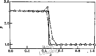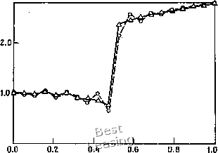 На рис. 10.14 приведено распределение давления вдоль центральной линии канала, рассчитанное на неподвижной и адаптивной сетках. Осцилляции, имеющие место в расчетах на не-подвияной сетке, типичны для методов сквозного счета второго порядка. Однако они отсутствуют в установившемся решении при использовании сетки, адаптированной к положению скачка. Можно привести еще один пример: однородный сверхзвуковой свободный поток с косым скачком, который также демонстрирует свойство этой схемы выстраивать сетку динамически ![]() Рис. 10.14. Распределение давления вдоль оси симметрии канала; А - решение, полученное на адаптивной сетке размером 20 X 7;--О--Решение, полученное на неподвижной сетке размером 20X7; /exit = 0.1. В процессе решения, сообразуясь с положением скачка. Это течение изображено на рис. 10.15. Так как задача является полностью сверхзвуковой, то мы не испытываем трудностей с заданием граничных условий на выходе и решаем уравнения Эйлера, зависящие от времени, записанные в дивергентной форме, на сетке, показанной на рисунке. Локально адаптированная к скачку сетка изображена на рис. 10.16. На рис. 10.17 показаны профили давления при t/ = 0, рассчитанные на неподвижной и адаптивной сетках. Отметим еще раз удивительный факт отсутствия осцилляции у численного решения, полученного на сетке, адаптированной к положению скачка. Подход с использованием сеток последнего типа имеет очевидные преимущества при использовании схем сквозного счета. В настоящем разделе мы ввели понятие о сетках, адаптированных к решению. Численное решение уравнений с частными Производными на адаптивных сетках приводит к существенному улучшению точности. Помимо изложенных методов находят