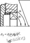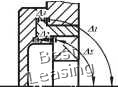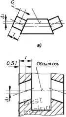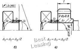 ![]() Общая ось валов АБ ![]() Рис. 3.9 Если l/d<0.8 или зубчатое колесо сопрягается с валом по переходной посадке, на положение кольца подшипника будут влиять отклонения от параллельности торцов втулки и колеса, а также торцовое биение заплечиков вала. Отклонения каждой из деталей будут составлять одну треть табличной величины. При креплении подшипника в корпусе наиболее характерными с точки зрения влияния на точность его позиционирования являются три схемы. Схема 1 (рис. 3.10, а). На точность положения наружного кольца подшипника влияет только отклонение от перпендикулярности заплечиков корпуса. Допуск на торцовое биение берется из табл. 3.10. Общая ось отверстий в корпусе ![]() ![]() ![]() Aj=A,=Л= Рис. 3.10 Схема 2 (см. рис. 3.10, б) На точность положения кольца подшипника влияют отклонения от параллельности торцов крышки и от перпендикулярности платиков корпуса В этом случае допуск расположения каждой из двух деталей будет составлять половину табличного. ![]() Рис. 3.11 В общем случае для несамоустанавливающихся подшипников суммарный перекос не должен превышать минимального зазора сопряжении 8, [ 6 ] (рис. 3.11): где 4 - отклонение от соосности относительно общей оси посадочных поверхностей вала (рис. 3.12, а); А2 - отклонение, вызванное деформацией упругой пинии вала под действием нагрузки (см. рис. 3.12,.б); 4з - отклонение от соосности относительно общей оси посадочных поверхностей корпуса (см. рис. 3.12, е); л) - отклонение от соосности отверстия втулки подшипника относительно оси наружной посадочной поверхности. На рисунке 3.12, г показан наиболее неблагоприятный вид отклонения. Схема 3 (см рис 3.10, е). На точность положения кольца влияют отклонения трех деталей: крышки, стакана и корпуса. Допуски параллельности торцов крышки и станка, а также перпендикулярности платика корпуса относительно общей оси будут составлять по одной трети табличного значения. На качестве работы подшипников сказываются отклонения формы дорожек качения колец, которые копируют неровности посадочных поверхностей вала и корпуса. С целью ограничения этого влияния стандартом устанавливаются жесткие требования к цилиндричности посадочных поверхностей вала и корпуса Для подшипников классов точности О и 6 допуск круглости и допуск профиля продольного сечения не должен превышать IT/4, где /Г - допуск размера посадочной поверхности вала или отверстия. 3.3. Допуски формы и расположения у подшипников скольжения Качество работы подшипников скольжения в значительной мере зависит от точности выполнения геометрических параметров втулки и вала. Суммарный перекос, возникающий при монтаже и во время работы подшипника, может привести к высоким удельным нагрузкам на его кромках, что нарушает режим гидродинамической смазки, возникают перегрев и повреждение трущихся поверхностей. Общая ось ![]() Ось наружной посадочной поверхности ![]() Рис. 3.12 Величину того или иного допускаемого отклонения при назначении требований детали рекомендуется выбирать: А, =А2=Аз=А4 =(Sr„i„-5)/4. мкм В большинстве справочников по конструированию подшипников скольжения отклонения формы у подшипников обычных конструкций, как правило, не регламентируется. Тем не менее, в специальной литературе экспериментально доказывается, что погрешность формы в поперечном сечении должна быть не более 6... 4 мкм, а в продольном сечении - не более 8... 6 мкм. 0 