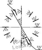 Поэтому величину параметра R рекомендуется назначать не более 0.33 от величины поля допуска на размер либо 0.5...0.4 от допуска расположения или формы. Если элемент детали имеет все три допуска, то следует брать допуск с наименьшей величиной. Переход от параметра R к параметру rg производится по соотношениям [ 7 ]: rg "=0.25r2 при r >8мкм; R„ - 0.2- R, при r < 8 мкм. После определения параметр rg округляют до ближайшего числа из ряда стандартных значений (см. приложение). ![]() Рис. 3.14 Пример 1 На чертеже детали задан размер 042k6[liQ(). Определить параметр шероховатости rg . Решение Допуск размера 1Т= 16 мкм. Параметр r = 0,33;Г= 0.33-16 = 5,3 мкм. Параметр rg = 0.2-r = = 0.2-5.3 = 1.06 мкм. Для нанесения на чертеже детали принимаем rg =0.8 мкм. Пример 2 На чертеже детали заданы 036кб1-(], допуск радиального биения ГР= 9 мкм и отклонение от цилиндричности TF = 4 мкм. Определить параметр шероховатости rg . Решение Допуск размера /7= 13 мкм, поэтому параметр r = 0.5 TF= 0.5-4 = 2 мкм. Параметр rg = 0.2-r = 0.2-2 = 0.4 мкм. Для нанесения на чертеже детали принимаем rg = 0.4 мкм. 3.4.4. Обозначение шероховатости поверхностей Шероховатость поверхности обозначают на чертеже для всех выполняемых по данному чертежу поверхностей изделия, независимо от методов их образования, кроме поверхностей, шероховатость которых не обусловлена требованиями конструкции. Структура обозначения шероховатости поверхности показана на рис 3.15. Параметры шероховатости по ГОСТ 2789-73" Вид обработки поверхности и другие дополнительные указания ![]() Базовая длина по ГОСТ 2789-73 Условное обозначение направлений неровностей Рис. 3.15 Для обозначения на чертежах шероховатости поверхности применяют знаки, приведенные на рис. 3.16. Числовые значения параметров шероховатости указываются после соответствующего символа (,Rz20, R,riax10), кроме значений параметра Rg, который проставляется без символа (см. рис 3.16) ![]() Знак наиболее предпочтительный. Высота h равна высоте размерных чисел Н = (1.5.3.0) h. Параметр Rg не должен превышать 0.4 мкм. Знак, показывающей, что поверхность образована путем удаления слоя металла. Параметр должен находиться в пределах 0.8..0.32 мкм. Знак, показывающий, что повер/хность образована без снятия слоя металла. Параметр Rg не должен превышать 1.6 мкм. Знак, показывающий, что повер/хность не обрабатывается по данному чертежу. Обозначения шероховатости поверхности, в которых знак не имеет полки, располагают относительно основной надписи чертежа так, как показано на рис. 3.17. При указании одинаковой шероховатости для части поверхностей изделия в правом верхнем углу чертежа помещают обозначение одинаковой шероховатости и знак шероховатости в скобках. Знак в скобках означает, что все поверхности, на которых на изображении не нанесены обозначения шероховатости, должны иметь шероховатость, указанную перед скобками. ![]() Rz32 5 .10 Рис. 3.17 Рис. 3.18 0.1 Sm 0.063 0.040 tso80±10%y 0.25 Размеры и толщина линий знака в обозначении шероховатости, вынесенном в правый верхний угол чертежа, должны быть приблизительно в 1,5 раз больше, чем в обозначениях, нанесенных на изображении (рис. 3.18). Пример указания шероховатости поверхности приведен на рис. 3.19. При указании двух и более параметров шероховатости поверхности в обозначении шероховатости значения параметров записывают сверху вниз в следующем порядке: • параметр высоты неровностей профиля, • параметр шага неровностей профиля, • относительная опо