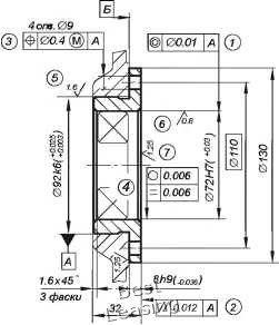 5.6. Стаканы 5.6.1. Простановка размеров На чертежах стаканов проставляются: габаритные размеры (осевой и диаметральный); размеры, входящие в размерные цепи. Остальные размеры наносятся исходя из конструктивных особенностей и технологии изготовления стакана. 5.6.2. Назначение допусков формы, расположения и шероховатости поверхности Положение стакана в радиальном направлении определяет его цилиндрическая поверхность, сопрягаемая с корпусом механизма, а в осевом - его фланец. В связи с тем, что длина посадочного диаметра стакана небольшая (l/d<0,8) и он сопрягается с корпусом по переходной посадке, основной конструкторской базой, лишающей деталь наибольшего числа степеней свободы, является торец фланца. Поэтому в качестве баз при назначении допусков расположения используются цилиндрическая поверхность и торец фланца стакана. = 0.2(D-d) В рассматриваемом случае: Т/2 = 0.2 (9-8) = 0.2 мм. В соответствии с ГОСТ 24643-81 принимается допуск в диаметральном выражении (табл. П.2.1): ТРР = 400 мкм. Допуск назначают зависимым, то есть таким, который можно превышать за счет изменения размеров сопрягаемых деталей в пределах их полей допусков. Позиция 3. Допуск параллельности торца для базирования манжеты торцу фланца крышки. Назначение технического требования - обеспечение качественной работы манжеты. Допуск параллельности задается на диаметре d = 52 мм примерно равным IT9 [8] В рассматриваемом примере для d = 52 мм 1Т9 = 74 мкм. Согласно ГОСТ 24643-81 принимается (табл. П.2.4): ТРА = 60 мкм. Позиция 4. Допуск радиального биения посадочной поверхности для манжеты Назначение технического требования - обеспечение качественной работы манжеты. Допуск задается на диаметре d = 52 мм IT6 [8]. В рассматриваемом примере для d = 52 мм IT6 =19 мкм Согласно ГОСТ 24643-81 принимается (табл. П.2.5): TCR = 16 мкм. Позиция 5. Шероховатость посадочных поверхностей под манжету. Назначение технического требования - предохранение манжеты от повреждений при монтаже и обеспечение надежной герметичности сопряжения. Рекомендуется [9] принимать Rg = 2.5мкм. Позиция 6. Шероховатость базовых поверхностей крышек. В соответствии с требованиями ГОСТ 18514-73 и ГОСТ 3325-85 шероховатость базовых поверхностей крышек рекомендуется принимать Rg = 1.6 .. 2.5мкм. Ниже В соответствии с позициями, указанными на рис. 5.14, даны краткие рекомендации по выбору допусков формы, расположения и шероховатости поверхностей деталей типа стаканов. Позиция 1. Допуск соосности посадочного отверстия для подшипника с внешней цилиндрической поверхностью. Назначение технического требования - обеспечение точности межосевого расстояния в передаче, а также норм контакта зубьев. Рассмотрим влияние отклонения от соосности отверстия стакана на межосевое расстояние. Допуск межосевого расстояния Т = 2\ fg следует рассматривать как допуск расстояния между осями вращения валов в средней плоскости / - / передачи (рис. 5.15), где ±4 - предельные отклонения межосевого расстояния (табл П.4.9). Точность межосевого расстояния определяется точностью расстояния между осями отверстий корпусной детали, отклонениями от соосности наружных колец подшипников качения, отклонениями от соосности стаканов и др. Поэтому допуск соосности стакана рекомендуется брать примерно равным 1 /3\fg I. Как видно из схемы (см. рис. 5.15), величина 4, вызываемая отклонением от соосности стакана, зависит также от расположе
