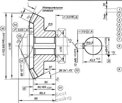 Позиция 6. Угол делительного конуса s2 s2 = 63°26. Вычисление угла приведено в табл. 5.21. Позиция 7. Степень точности. Выбор степени точности конического зубчатого колеса производится на основе конкретных условий работы передачи, в соответствии с рекомендациями, приведенными в табл. 5.6. Повышающие передачи не рекомендуется выполнять с передаточными числами, превышающими 3.15. Числа зубьев шестерни и колеса рекомендуется выбирать с учетом минимально допустимых чисел зубьев шестерни и колеса, приведенных в табл. 5.24. Таблица 5.24 8-В ГОСГ 7758-81 Позиция 8. Размеры зуба в измерительном сечении. Во второй части таблицы - данные для контроля - выбраны следующие параметры: • постоянная хорда зуба sg2 =5.6496 мм (см. табл. 5.21) и предельные отклонения на нее, которые определяют боковой зазор (расчет предельных отклонений см ниже); • высота до постоянной хорды Лег = 1972 мм (см. табл. 5.21). Выбор показателей точности конического зубчатого колеса Показатели точности предлагается выбирать и указывать в учебных целях. Показатели или комплексы точности выбираются в зависимости от степеней точности (см. табл. 5.22). Каждый установленный комплекс показателей является равноправным с другими, хотя при сравнительных оценках влияния точности передач на их эксплуатационные качества основными и единственно пригодными во всех случаях являются функциональные показатели Ff, f,. fjj, и относительные размеры суммарного пятна контакта. При выборе показателей или комплексов точности следует учитывать конкретные условия производства, в частности, наличие тех или иных измерительных средств. Требования стандарта относятся к зубчатым колесам, установленным на их рабочих осях. Нормы бокового зазора Наименьшее отклонение средней постоянной хорды зуба и допуск на нее определяются по табл. П.6.7, П.6.8 и П.6.9. Приведенные значения относятся к сечению, проходящему по среднему конусному расстоянию R. Выбранное измерительное сечение (см. рис. 5.23) находится на торце зубчатого колеса, поэтому выбранные значения наименьшего отклонения и допуска следует увеличить в - раз, где Rg - внешнее конусное расстояние. Наименьшее отклонение постоянной хорды зуба в измерительном сечении: scs 1 scs 71.352 где escs = 30 мкм - наименьшее отклонение средней постоянной хорды зуба (см. табл. П.6.7); Ki = 4.2 - коэффициент, определяемый по табл. П.6.8. Допуск на среднюю постоянную хорду: где Г =130мкм (см. табл. П.6.9). Нижнее отклонение средней постоянной хорды зуба: %с/ = %cs-Tsc=~48-153 = -301 мкм. Показатели кинематической точности конического зубчатого колеса Принимаем комплекс (8-я степень точности): • допуск на погрешность обката Г = 50 мкм (см. табл. П.6.1), • допуск на радиальное биение зубчатого венца Г = 71 мкм (см. табл. П.6.1). 0 1 2 3 4 5 6 7 8 9 10 11 12 13 14 15 16 17 18 19 20 21 22 23 24 25 26 27 28 29 30 31 32 33 34 35 36 37 38 39 40 41 42 43 44 45 46 47 48 49 50 51 [ 52 ] 53 54 55 56 57 58 59 60 61 62 63 64 65 66 67 68 69 70 71 72 |