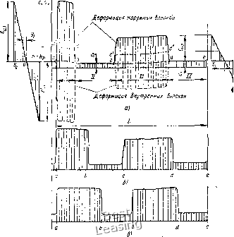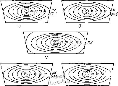 0,5 V Для установления зависимости отдельных потерь были провё-деныспециальные испытания четырех вариаторных ремней с раздельным определением составляющих потери мощности [75]. Для этого опыты проводились последовательно на гладких и желобчатых шкивах на холостом ходу и под нагрузкой. Параметры испытаний: t = 1, Dj = D2 = 210 мм, ф = 28°, и = 8,25 и П м/с. Сто = 8... 10 кгс/см. Полученные из опытов относительные потери приведены в табл. И, а на рис. 46 показаны суммарные потери АЛ в зависимости от коэффициента тяги при испытании на гладких (а) и желобчатых (б) шкивах. Характеристика первых трех зубчатых ремней дана в табл. 10 соответственно под № 1, 5 и 6; ремень 4 - кордтканевый сплошной сечением 63x22 мм. В табл. 11 приведены потери при наибольшем КПД, но при разных коэффициентах тяги. Разность ординат кривых а и б на рис. 46 составляют потери на радиальное скольжение и поперечное сжатие. Как видно из рисунка и табл. 11, эти потери были основными по величине. Они оказались особенно большими для опытных ремней 1,3 и4 вследствие недостаточной их поперечной жесткости. У серийного ремня 2 с формованным зубом без обертки, и с применением резины высокой твердости эти потери были в 3 ...3,5 раза меньше. Вторыми по величине были потери от изгиба „. Определенные вместе с ними аэродинамические потери 1а вследствие малой скорости ремней были незначительны. Показательно, что у сплошного ремня 4, несмотря на меньшую высоту сечения по сравнению с ремнем 5, потери на изгиб были выше, а у кордшнурового ремня 2 они были в 2 раза меньше, чем у корд-тканевого ремня 1. Вследствие более высокого модуля упругости £„ ремень 2 показал наименьшие потери от упругого скольжения и от нагрузки „. Из табл. 11 также следует, что потери скорости были значительно больше упругого скольжения, что свидетельствует о большой роли кажущегося скольжения. Повышенные потери скорости опытных ремней объясняются также малой их жесткостью на сжатие. А. Н. Шмелевым по специальной методике и определенным экспериментально потерям [95 ] были рассчитаны температурные поля, примеры которых для приведенных выше ремней 1,2 и 4 даны на рис. 47. Замеренная в опытах температура ремней в их центре и на рабочей поверхности оказалась близкой к расчетной. Рис. 46. Потери мощности AN при широких ремнях: а - иа гладких; б - иа желобчатых шкивах [75] (номера ремией по табл. 11, в скобках - по табл. 10) Из рис. 47 следует, что теплонапряженность вариаторных ремней очень высокая и полностью соответствует характеристике ремней по потерям. Так, наивысшая температура до 150° С ока- ![]() г) д) Рис. 47. Температурные поля широких ремней: а N» 1 (по табл. 11) при О = 210 мм; 6 - № 1 при D = 300 мм; в - № 4 при О = 210 мм; г - № 2 при D = 210 мм; а - № 2 при D - 300 мм 11. Потери в передачах с широкими ремнями [70]