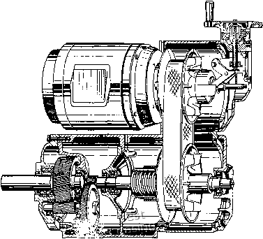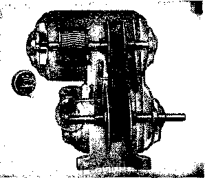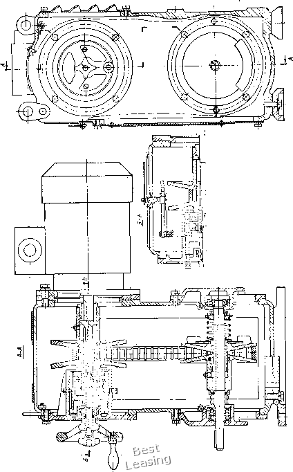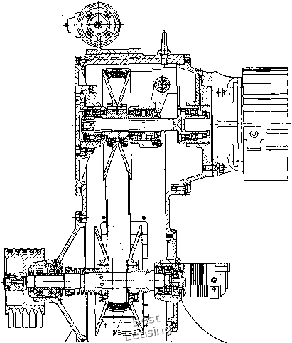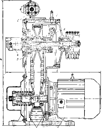 пус выполнен с отъемными лапками, позволяющими при стандартных деталях по-разному располагать вариатор в пространстве. В вариаторе фирмы US. Electrical motors (рис. 76) корпус более основательный, двигатель фланцевый. При конструировании вариаторов с целью хорошего охлаждения ремня должна быть предусмотрена вентиляция корпуса и обдув ремня и шкивов. Для этого в последнем вариаторе на кор- ![]() Рис. 76. Вариатор корпусного типа с фланцевым двигателем пусе предусмотрены жалюзи, а диски выполнены с лопастями. Вариатор выпускается для мощностей до 50 кВт с Д <: 10. При Л/" > 22 кВт применяются два ремня; пружина в зтом случае размещается между средними дисками ведомого вала. Одной из первых клиноременные вариаторы стала выпускать фирма Reeves. На рис. 77 показана одна из последних моделей вариаторов этой фирмы. Ведущий шкив вариатора сидит на консольном валу фланцевого двигателя, а сам вариатор прифланцо-ван к редуктору, что создает весьма компактный привод. Перемещение дисков одностороннее; передвижные диски размещаются в шкивах с противоположных сторон. В вариаторе осевая сила не замыкается на ведущем шкиве, а передается на подшипники вала двигателя. Фирма выпускает вариаторы зтого типа с параметрами: N, кВт, до............... 1,1 3 ... И 18 30 37 Д ................... 10 8 5,5 4 3 На рис. 78 изображен вариатор ВР-1 конструкции ЭНИМС [12], рассчитанный для работы при постоянной мощности. С этой целью ведущий шкив 2, сидящий на валу фланцевого электродвигателя 1, сделан пружинным. Ведомый шкив 3 регулируется принудительно. Вариатор может быть снабжен ручным или дистан- ционным управлением. В последнем варианте регулирование производится серводвигателем 5 через червячную передачу, винтовую пару и ;систему рычагов 6. Для ограничения хода дисков поста- Рис. 77. Вариатор корпусного типа, скомбинированный с редуктором и фланцевым двигателем ![]() влены концевые выключатели. Для отсчета угловой скорости ведомого вала на вариаторе устанавливается тахогенератор 4, соединенный с ведомым валом. 16. Техническая характеристика вариаторов ЭНИМС Типоразмер ВР-1 ВР-1 ВР-2 ВР-3 ВР-4