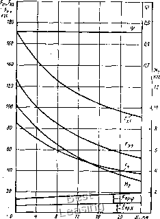 ремни наиболее подходят из ряда 2-В (см. табл. 6) с относительной шириной V = 2,25. Учитывая допустимость меньшего срока службы ремня и кратковременность работы вариатора на наименьшем диаметре при Мщах, допускаемое полезное напряжение для вариаторов мототранспортных средств принимают повышенным: для мопедов и мотороллеров [k] = 15 кгс/см; для мотонарт до 30 кгс/см. Расчетным является положение при i и передаче наибольшего момента двигателя М. Расчет ведется по формуле (148), в которую вместо отношения Ni/iii вводят MJ97 400. После определения осевых сил Fi и f 2 в крайних положениях выбирают вид нажимных устройств обоих шкивов и их характеристики так, чтобы создаваемые ими осевые силы были возможно ближе к требуемым. Желательно характеристики нажимных устройств принимать такими, чтобы коэффициент тяги на всем диапазоне был бы в пределах оптимальных значений = = 0,5 ... 0,8, что обеспечивает и наибольший КПД вариатора. Рациональность выбранной схемы и параметров вариатора следует проверить детальным поверочным расчетом. Последний проводят для нескольких значений момента двигателя в том же порядке, что и для стационарных вариаторов (см. с. 160). В отличие от последних частота вращения вала двигателя в подобной трансмиссии зависит от нагрузки. Поэтому начало поверочного расчета ведут при неизвестной частоте п. После определения осевой силы Fi из формулы, характеризующей нажимное устройство ведущего шкива [типа зависимости (152)], находят частоту вращения п, по которой устанавливают скоростной режим работы трансмиссии. Сопоставление полученного значения tii при данном моменте двигателя с внешней его характеристикой указывает на реальность данного режима. На рис. 100 приведен, для примера, график изменения основных параметров вариатора мотонарт, полученный из подобного ![]() Рис. 100. Силовая характеристика вариатора мотонарт при Mj = 3,25 кгс-м поверочного расчета. Из графика ВиДно, чТо в данном случае характеристика нажимных устройств подобрана так, что осевые силы Fxi и f ,2 изменяются соответственно передаваемому моменту Мз, что обеспечивает работу вариатора почти при постоянном коэффициенте тяги ip. При этом большая часть осевой силы создается кулачком за счет момента и малая ее часть за счет закрутки пружины Fnpv и ее сжатия Fnpx-- Получение из расчета подобных графиков для ряда моментов и построение на их основе тяговой характеристики по примеру графика рис. 98 дает полную характеристику вариатора и всей трансмиссии. Глава 6 ТЕОРИЯ И ОСНОВЫ РАСЧЕТА ФРИКЦИОННЫХ ВАРИАТОРОВ 6.1. ОБЩИЕ СВЕДЕНИЯ Фрикционная передача позволяет легко осуществить бесступенчатое регулирование скорости, вследствие чего фрикционные вариаторы получили широкое применение. Благодаря тому, что фрикционная пара включает детали, являющиеся реальным воплощением соответствующих аксоид в относительном движении, она может наиболее точно обеспечить мгновенное значение передаточного отношения. Не следует возлагать на фрикционную пару функции предохранительного звена при перегрузках, так как при буксовании на ведомом колесе образуется местный износ, приводящий впоследствии к возникновению вибраций и ударов, а также к интенсивному износу. Фрикционным передачам свойственны существенные недостатки: большие давления на валы и опоры, связанные с использованием сил трения в их работе; нежест