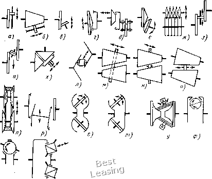 ных случаях (рис. 112, в ... дас) один из валов должен перемещаться. С целью ограничения скольжения в крайних положениях и уменьшения габаритных размеров диапазон регулирования вариаторов с непосредственным контактом колес принимают равным 2,5 ... 3 и в крайнем случае в некоторых схемах равным 4 ... 5. В вариаторах с промежуточным элементом регулирование может производиться изменением: ![]() Рис. 112. Схемы фрикционных вариаторов диаметров обоих колес при неизменном диаметре промежуточного элемента-паразита (рис. 112, з ... п, с ... у); радиусов качения промежуточного элемента при постоянных диаметрах ведущего колеса и ведомого (рис. 112, ф... ц)\ радиусов одного из колес и одного из промежуточных элементов (рис. 112, р). Передачи последнего типа являются по существу двухступенчатыми. Наиболее отчетливо это видно из сравнения схем на рис. 112, г и р. Наличие в вариаторах с промежуточным элементом двух регулируемых колес позволяет расширить диапазон регулирования до Д = 6 ... 10. Кроме того, неизменность положения входного и выходного валов упрощает соединение вариатора .этого типа с сопряженными агрегатами. в большинстве случаев в вариаторах с промежуточным элементом применяются многопоточные передачи - с несколькими параллельно работающими такими элементами (рис. 112, с ... ц). С применением вспомогательных зубчатых пар могут быть выполнены многопоточными также передачи по схемам, показанным на рис. 112, 3, и, о. Передачи многопоточные при тех же габаритных размерах могут передавать большую мощность, и основные валы в них разгружены от радиальных сил. Однако при конструировании и выполнении этих передач важнейшим условием их работоспособности является обеспечение равномерного прижатия всех пар и высокая степень точности изготовления тел качения. Лобовые вариаторы с цилиндрическим роликом (рис. 112, а, з) имеют значительное геометрическое скольжение и потому нецелесообразны. Применяют их лишь во второстепенных передачах малой мощности, в частности в счетно-решающих устройствах. Более целесообразны передачи с коническими роликами (рис. 112, в и). Передачи, изображенные на рис. U2, б, м, н, о, при малых углах конусов дают меньшее скольжение, но имеют большие габаритные размеры. Из вариаторов без паразитных колес получили распространение передачи, показанные на рис. 112, г, д; они несложны в изготовлении и при малых значениях Д дают удовлетворительную характеристику по скольжению. Передачу, изображенную на рис. 112, е, применять нецелесообразно, так как расположение вершин конусов по разные стороны рабочего пояска обусловливает значительное скольжение; начальный контакт в точке ограничивает применение схемы передачами малой мощности. Многодисковые передачи (рис. 112, ж) имеют также значительное геометрическое скольжение. Однако возможность использования большого числа параллельно работающих дисков позволяет уменьшить длину линии контакта, снизить тем самым скольжение и одновременно значительно повысить передаваемую мощность. Передачи этого типа с парами, работающими в масле, выпускаются на гораздо большие мощности, чем передачи других типов. Передача с двумя парами раздвижных конусов (рис. 112, п) выполняется с самозатягивающимся кольцом. Она отличается значительным относительным скольжением, компактна, но работает с большими нагрузками на валы и опоры; КПД е