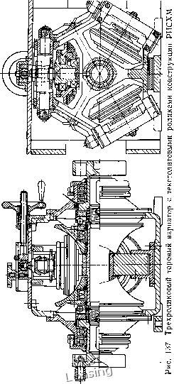 И. Ф. Тележников рекомендует также производить предварительную обкатку текстолитовых роликов, при которой их поверхность уплотняется, а выдавливающаяся при этом смола покрывает рабочие поверхности роликов и чашек тонким слоем, способствующим повышению коэффициента трения. В качестве расчетного он принимает / = 0,38. Эти вариаторы успешно эксплуатируются на Уралмашзаводе в приводах станков для испытания абразивных кругов диаметром 900 мм. В разделе 6.8 отмечалось, что в случае выхода осей вращения фрикционных катков из одной плоскости (см. рис. 114) возникает вдоль образующей катка составляющая скорости скольжения, стремящаяся изменить взаимное положение катков. Как показали эксперименты [91 ] с торовыми вариаторами, возникающие моменты самоперевода роликов оказываются весьма значительными и повышаются с увеличением смещения осей и передаваемой нагрузки. Даже при смещении оси текстолитового ролика относительно оси стальных чашек на 0,1 мм момент самоперевода оказывался примерно равным моменту на ведомом валу. Направление момента самоперевода роликов связано с направлением их вращения. Эффект самоперевода роликов при вращении передачи используют для точной установки их осей при сборке вариаторов. Кроме того, этот эффект в ряде случаев используют для изменения передаточного отношения вариатора. На рис. 136 показан пример конструкции самосервируемог j механизма управления вариа*гором. В этом механизме траверсы /, несущие на себе ролики, имеют хвостовики 3 с резьбой. На хвосто- ![]() Рис. 136. Конструктивная схема самосервируемого механизма управления торовым вариатором виках сидят гайки 2, фиксированные в осевом направлении буртиками. Хвостовики 3 имеют в гайках минимальный осевой люфт. На гайках закреплены зубчатые секторы 4 и 7, сцепляющиеся между собой, а также с шестерней 6, при повороте которой дости- ьчччччччд гается изменение передаточного отношения вариатора. При этом происходит поворот гаек 2, в результате чего оси роликов отклоняются от плоскости XX передачи и ролики начинают поворачиваться в плане, смещаясь одновременно вдоль оси траверсы, пока их оси не возвратятся в плоскость XX. На перевод роликов в рассматриваемом механизме] будет оказывать некоторое влияние наличие двух окружных сил на ролике, также стремящихся с помощью резьбы повернуть ролик. Поэтому самоперевод роликов будет исчезать не при точном совмещении их осей с плоскостью XX передачи, а при некотором смещении, компенсирующем указанное влияние окружных сил. Для ограничения относительного поворота винтовых пар в пределах величин А имеются кулачки 5, укрепленные на хвостовиках траверс роликов и располагаемые в прорезях гаек 2. Для синхронизации поворота траверс последние внизу сблокированы зубчатыми секторами 8. Приведенный механизм управления вариатором требует в десятки раз меньшего усилия управления в сравнении с усилием, необходимым при непосредственном повороте траверс, что позволяет в большинстве случаев обойтись без сервомеханизма. ![]() ![]() Рис. 138. Конструкция нажимной муфты Торовые вариаторы с хордальным расположением роликов обеспечивают малое геометрическое скольжение, высокий КПД, малое колебание запаса сцепления, но требуют квалифицированного изготовления и ухода. Такие вариаторы целесообразны для применения лишь при серийном их изго