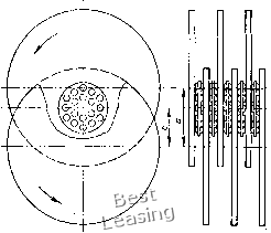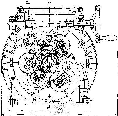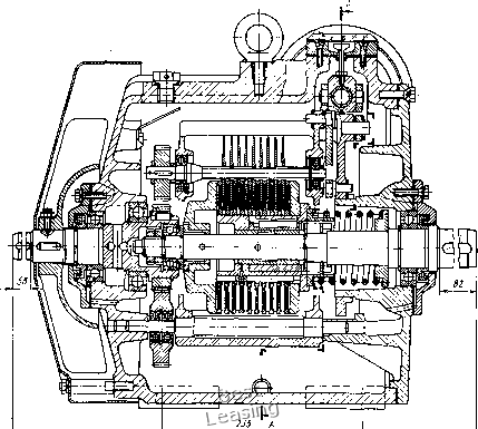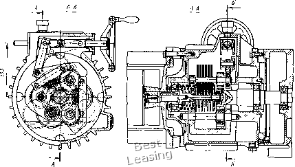 особенно важно в наиболее удаленных точках от начальной линий касания. На рис. 147, а и б вектор Uo™ характеризует скорость относительного скольжения в произвольной точке А контактного пятна. Сравнение показывает, что при внутреннем контакте вектор Ооти меньше, чем при внешнем. Поэтому передача с внутренним касанием имеет более высокий КПД. Однако в передаче с внутренним контактом удается получить меньший диапазон регулирования в одной ступени, а сама передача при нескольких промежуточных пакетах дисков конструктивно более сложна. В результате стремления повысить геометрический КПД многодискового фрикционного вариатора появилась показанная на рис. 148 схема многодисковой передачи с плоскими дисками. Между плоскими дисками этой передачи в специальных кронштейнах размещены разделенные сепараторами шарики, которые движутся по круговым траекториям, вследствие чего устраняется большая доля потерь от геометрического скольжения. Регулирование скорости достигается перемещением сепараторов с шариками, т. е. изменением эксцентриситета е. В отличие от других фрикционных вариаторов эта передача допускает регулирование скорости в неподвижном состоянии и обеспечивает широкий диапазон регулирования, начиная с частоты вращения ведомого вала, равной нулю. Применение таких вариаторов целесообразно при небольших мощностях (до 1 кВт). Преимущественное распространение получила схема вариатора с внешним контактом конических дисков, схема с внутренним контактом применяется в основном в комбинации со схемой с внешним контактом в двухступенчатых передачах. Схема с внешним контактом дисков выполняется в двух основных Модификациях: с ведущим центральным и ведомым периферийным пакетами; с ведущими периферийными пакетами и центральным ведомым пакетом. В обеих модификациях ведущими звеньями являются конические диски, а ведомыми - отбуртованные. Первая схема применяется в вариаторах на малую мощность (японской фирмой Sumitomo до 2,2 кВт, западногерманской фирмой Schaerer до 7 кВт). В связи с небольнюй передаваемой ![]() Рис. 148. Схема многодисковой фрикционной передачи с плоскими дисками Мощностью в передачах, выполняемых по этой схеме, нет надобности увеличивать скорость вращения ведущих конических дисков. Последние располагаются непосредственно на входном валу вариатора (рис. 149). На этом же валу располагается нажимное устройство, состоящее из двух-четырех параллельно работающих пружин. Мощность с ведомых пакетов передается ведомому валу вариатора при помощи многопоточной редуцирующей зубчатой передачи, соединяющей периферийные шлицевые валики с выходным валом. Вариатор, показанный на рис. 149, имеет три периферийных пакета, вдвигание и выдвигание которых осуществляется ![]() Рис. 149 Вариатор AS 3/15 фирмы Schaerer с ведущим пакетом конических дисков сблокированной системой рычагов и винтовой парой с маховичком на конце винта. Вторая схема является наиболее распространенной схемой многодисковых вариаторов с внешним контактом. Благодаря расположению на входной стороне вариатора многопоточной мультиплицирующей зубчатой передачи частота вращения ведущих периферийных пакетов повышается до 5000 об/мин, что особенно важно при передаче значительных мощностей. На рис. 150 показана конструкция многодискового вариатора, разработанная во в ВНИИМЕТМА