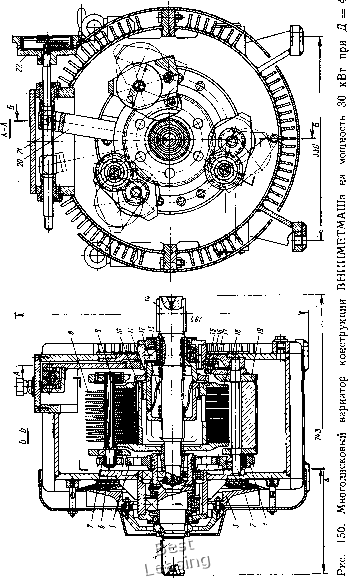 О ог o,f o,s 11,% 0,8 п., может изменяться расстояние между шлицевыми валиками и выходным валом и тем самым обеспечивается регулирование скорости вращения выходного вала. Движение валикам 6 передается от входного вала 4 через трехпоточную ускоряющую зубчатую передачу, состоящую из шестерен 5, i и 7. При повороте кареток 19 на осях 2 зацепление шестерен не нарушается, происходит лишь обкатывание шестерен 7 по паразитным шестерням /. Поворот всех трех кареток производится вращением шайбы в радиальные пазы которой входят сухари 17, сидящие на хвостовиках кареток. Поворот шайбы 16 производится рычагом 20 при помощи винтовой пары 21 и маховичка 22. При дистанционном управлении и в крупных вариаторах вращение регулировочного винта производится через вспомогательный редуктор серводвигателем, укрепленным на корпусе вариатора. Прижатие фрикционных дисков осуществляется нажимным устройством, состоящим из трехку-лачковых стаканов и 12 с винтовой рабочей поверхностью кулачков. Стакан закреплен непосредственно на выходном валу вариатора, а стакан 12 при помощи втулки 15 соединен с нажимным фланцем 18 центрального пакета дисков. Винтовое нажимное устройство обеспечивает автоматичность изменения прижатия дисков пропорционально крутящему моменту Ма. Пружина 13 устраняет зазоры в соединениях, обеспечивая предварительное поджатие дисков, необходимое во время пуска. Для лучшего теплоотвода корпус вариатора выполнен с ребрами и, кроме того, обдувается укрепленным на входном валу вентилятором 3. Передача работает в масляной ванне. Фирмой Sumitomo по второй схеме изготовляются вариаторы с Д = 4 на номинальную мощность Ni от 1,5 до 75 кВт при = = 1500...750 об/мин, imin = 1,25...0,81. Фирма Schaerer изготавливает вариаторы на мощность до N2 = 250 кВт при til = 1470 об/мин и Пашах = 1850 об/мин с Д = = 4,3...4,8., На рис. 151 показано изменение КПД и скольжения при 100%-ной нагрузке в зависимости от передаточного отношения для вариаторов Sumitomo, - типичное для многодисковых вариаторов. Также по второй схеме ВНИИРедуктором (Киев) разработан нормальный ряд отечественных многодисковых вариаторов с параметрами, приведенными в таб. 22. Рис. 151. Нагрузочные характеристики вариаторов фирмы Sumitomo На рис. 152 показана конструкция вариатора ВД-5,5 ВНИИ-Редуктора. В этом и других небольших типоразмерах вариаторов ВНИИРедуктора применены нажимные устройства роликового типа, что улучшает четкость срабатывания такого устройства в сравнении с обычным кулачковым, поскольку ролик по кулачку не скользит, а перекатывается. Скольжение ролика на цапфах ![]() -610 Рис. 152. Многодисковый вариатор крестовины происходит на малых радиусах, в результате уменьшаются потери на трение. Расширение диапазона регулирования многодисковых вариаторов достигается либо применением дополнительного зубчатого перебора (рис. 153, а), либо использованием двухступенчатых вариаторов (рис. 153, б). По схеме, показанной на рис. 153, а, фирма Sumitomo изготовляет вариаторы на мощность Ы- до 22 кВт при Д = 12. По схеме на рис. 153, б фирма Schaerer выпускает двухступенчатые вариаторы на мощность до 3 кВт с Д до 15, а фирма Sumitomo - до 3,7 кВт с Д = 10; 12. Положительной особенностью вариатора, выполненного по этой схеме, является отсутствие в нем зубчатых передач, требующих тщательного изготовления. Однако вследствие неблагоприятного распределения нагрузки между ступенями, при котором втор