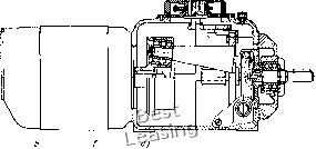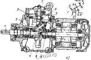 -V -г ,iSt 1 -0,3k ;Г 7 0-7 -3 0,7t 0,20 0,31* Рис. 176. КПД передачи 2К-Н Рис. 175. Кинематические схемы и диаграммы передаточных отношений передачи 2К-Н Несмотря на многообразие форм тел качения и конструкций планетарных вариаторов, почти все их кинематические схемы можно свести к двум: двухступенчатым передачам 2К-Н и ЗК по терминологии В. Н. Кудрявцева [43]. Рассмотрим передачи 2К-Н. Кинематические схемы и характеристики их показаны на рис. 175, кривые КПД - на рис. 176. Диаграммы заимствованы из работы [43], по которой сохраняются и все обозначения. Регулируемым в этих передачах является один из сателлитов (чаще колесо /) или оба сателлита. Регулируемые элементы выполняются коническими или сферическими. Нерегулируемая пара может быть как фрикционной, так и зубчатой. Ведущим элементом могут быть центральное колесо а или водило Н. Колесо b - неподвижно. Передаточное отношение при ведущем колесе а будет ib = 1 = 1 ± ГЬ rgx где Гд, Гь - радиусы центральных колес; сателлитов, в общем случае * переменные. (243) радиусы в формуле (243) знак плюс при передаточном отношении простой передачи при < О, когда одно из центральных колес с внутренним, а второе с внешним контактом; знак минус - при > О, когда оба центральных колеса с одинаковым контактом. На рис. 179 передаточное отношение t, этих передач изображается наклонной прямой. Диапазон регулирования подобной передачи при регулировании одного сателлита / Д max /min ± /max (244) ![]() Рис. 177. Планетарный конусный вариатор фирмы S-Timpo Kogyo: а - разрез; б - кинематическая схема В вариаторах центральные колеса и сателлиты чаще всего делаются коническими. Нерегулируемые пары целесообразно выполнять с совпадающими вершинами конусов, что исключает геометрическое скольжение. В этом случае в формулы (243) и (244), так же как и во все последующие в этом разделе, для этих пар вместо отношения радиусов сопряженных колес следует подставлять отношение синусов половин углов при вершине конусов. Из формулы (244) видно, что при < О (в формуле - знак плюс) Д < , и большего диапазона регулирования получить нельзя. Передачи этого типа чаще применяются для достижения компактности и значительного редуцирования скорости; КПД их высокий (рис. 176). На рис. 177 показан планетарный конусный вариатор фирмы Shimpo Kogyo, выполненный по этой схеме. Фрикционные тела в нем работают в масле. Движение с ведущего солнечного конуса 8 передается ведомому валу / через двойные конические сателли- ты 7, оси которых закреплены в водиле 4. Невращающееся кольцо 6 может перемещаться в осевом направлении при помощи реечной передачи 3 и маховичка 5, чем и обеспечивается регулирование скорости. Нажатие осуществляется шариковым нажимным устройством 2, предварительное поджатие - пружинами 9. Угол наклона оси сателлитов к оси вала (рис. 177, б) б 35 ... ... 40°. Половина угла регулируемого конуса б. Во избежание геометрического скольжения в паре a-g углы и должны быть ctg «а = - cos б sin б и а„ = б - а„. Такие вариаторы изготовляют на мощность до 3,7 кВт при Д = 6. Нагрузочная характеристика наибольшего типоразмера вариатора: По, Об/мин................. 62 120 200 280 375 Mj, кгс-см ................ 475 1000 1360 1030 780 Вследствие значительного понижения отпадает надобность в установке последующих редукторов. Передаточное отношение в передаче 2К-Н с ведущим води-лом Н и неподвижным колесом b будет 1 -i 1 ± l-fxra (245) Как видно из формулы (245), в этой передаче можно получить регулиро