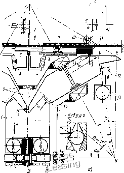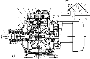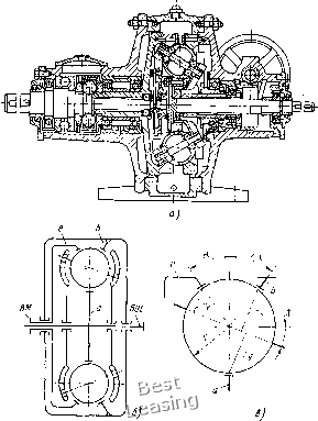 Передаточное отношение определяется зависимостью (246), при этом гь sinaj « гь sin аь cos (Р - gg) Га ~ sin аа ~~ cos (Р -Н ag) тогда COS (р -«g) cos(p+ ag) Таким образом, пгредача обеспечивает регулирование скорости в широком диапазоне с переходом через нуль в точке Б. По оси симметрии пра-h сателлиты соприка- саются с левыми и катятся один по другому без скольжения, будучи прижатыми силой Р. На ведущем полом валу 17 расположены две нажимные шайбы: левая сидит неподвижно, правая - свободно. Последняя связана штифтом с поршнем 16. Винтом 18 шайбы могут быть раздвинуты, чем обеспечивается выбор зазоров и предварительный натяг в передаче. В передаче используются два параллельно работающих планетарных механизма. Учитывая неизбежность погрешностей изготовления, съем мощности осуществляется не непосредственно с колец 11, а через конический дифференциал, включающий конические шестерни 4, три (или более) 6. ![]() 18 П Рис. 180. Схема планетарного сдвоенного вариатора конструкции Е. И. Пирожкова: а - конструктивная; б - кинематическая конических сателлита 5 и водило Использование конического дифференциала в качестве уравнительного механизма исключает возможность появления в передаче циркулирующей мощности. Водило 6 имеет зубчатый венец, движение с которого передается ведомой шестерне 7, сидящей на выходном валу. Регулирование скорости вращения ведомого вала осуществляется синхронным сближением или удалением колец при помощи механизма управления, состоящего из двух половин. Каждая половина включает поводок 3, кулачки которого перемещаются по трем пазам в цилиндре 8, зафиксированном относительно конуса вариатора. Охватывающий цилиндр 9 имеет на внутренней поверхности правую и левую нарезку, при помощи которой он навинчивается на выступающие кулачки поводка 3. Вращение цилиндра 9 осуществляется червяком 10. В другом варианте этого вариатора кольца 11 могут быть неподвижными, а конусы 12 - ведомыми. Форма и размеры сателлитов 2 выбраны так, что действующие на них силы Pi, Р2, р3 и Р обеспечивают их полное равновесие. Количество сателлитов в ряду определяется условиями соседства и должно быть не менее трех; рекомендуется его принимать равным шести. Исследование, проведенное Е. И. Пирожковым, показало, что угол конуса сателлита целесообразно принимать равным углу р наклона его оси. Это обеспечивает более надежную работу нажимного механизма, так как рабочие участки соответствующих опорных поверхностей правых и левых сателлитов оказываются параллельными. Кроме того, этот вариант обеспечивает передачу постоянной мощности на всем диапазоне регулирования. Реверсирование колец 11 в этом, случае утрачивается. К отличительным особенностям вариатора Е. И. Пирожкова следует отнести следующие. Благодаря уравновешенности сателлитов валы и подшипники этого вариатора полностью разгружены от нормальных контактных сил. Использование значительного количества сателлитов, расположенных в два ряда, позволяет существенно повысить передаваемую мощность при малых габаритных размерах вариатора. Вынесение контакта сателлитов с охватывающими их кольцами (в котором имеет место геометрическое скольжение) на наибольший радиус облегчает его работу. На площадках основного контакта сопрягаются поверхности с разными знаками кривизны и близкими радиусами кривизны, что благоприятно влияет на к