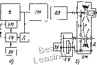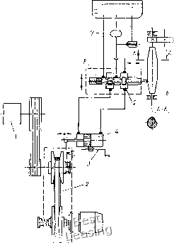 На рис. 191, а показана принципиальная схема автоматического регулирования заданных технологических или рабочих параметров. Она может быть использована, например, для поддержания постоянной линейной скорости намотки рулонов бумаги, металлической ленты, проволоки, для поддержания постоянной скорости резания при торцовой обработке крупных деталей, для поддержания постоянства давления технологического пара ![]() Рис. 190. Схемы автоматического регулирования для поддержания заданной угловой скорости: я - принципиальная (электрическая); б - механическая в трубопроводах и т. п. В каждо л из таких случаев должен применяться датчик по соответствующему параметру. На рис. 191, б изображено простейшее рычажное механическое устройство, обеспечивающее постоянство линейной скорости ма- ![]() Рис. 191. Схемы автоматического регулирования для поддержания заданных технологических или рабочих параметров: я - принципиальная; 6 - механического регулирующего устройства, которое обеспечивает постоянство линейной скорости наматываемого иа барабан материала; / - ролик; 2 - барабан; 3 - тяга к механизму управления вариатора териала, наматываемого на барабан 2. С этой целью тяга 3 связана с механизмом регулирования вариатора и устанавливает нужную скорость вращения барабана в зависимости от диаметра намотки. На рис. 192 показана система автоматического поддержания постоянства заданной скорости резания при обработке деталей на токарном станке. Здесь требуемая скорость резания устанавливается задающим устройством ЗУ, датчик Д - по диаметру обработки. Задающее устройство и обратная связь соединены с сравнивающим устройством (соленоидом) при помощи реохордов. Соленоид в зависимости от знака результирующего напряжения выдает команду «Медленнее» или «Быстрее» на управляющий механизм вариатора, чем обеспечивается соответствие скорости вращения планшайбы обрабатываемому диаметру заготовки. На рис. 193 показана схема регулируемого привода к веретенному барабану 1 прядильной машины с автоматическим регулятором, служащим для поддержания постоянства скорости намотки нити. Регулятор состоит из управляющего гидроцилиндра 4 и следящего устройства, включающего золотник 5 и копир 6. Давление в гидросистеме создается насосом 7. При нейтральном положении штока 8 золотника сечения двух выходных отверстий одинаковы и поршень гидроцилиндра неподвижен. При смещении копиром штока золотника соотношение проходных сечений изменяется; на выходе золотника и в полостях гидроцилиндра создается разность давлений,что приводит к смещению поршня и изменению вариатором 2 частоты вращения барабана 1. Копир вращается от вала мотального эксцентрика. По завершении одного оборота копира, соответствующего двойному ходу кольцевой планки,направляющей нить, золотник смещается вдоль копира, что ведет к изменению частоты вращения барабана 1 в соответствии с изменением диаметра намотки. Первоначальная настройка регулятора на заданную скорость, необходимую для данного номера пряжи, производится перемещением гидроцилиндра 4 винтом 3. На рис. 194 приведена схема еще одного примера автоматического управления вариатором с целью поддержания заданных рабочих параметров (в Жданном случае автоматической подачи топлива в котельной). Задачей автоматического регулирования здесь является о