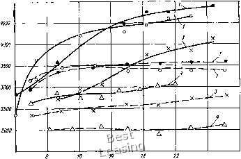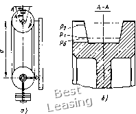ной шириной v = 2,0. По этому стандарту ряд длин в пределах, указанных в табл. 6, располагается по ряду нормальных чисел i?20; угол клина ремня в недеформированном состоянии 34 ± ±Г. Угол клина ремня при изгибе его на шкивах уменьшается, и тем больше, чем меньше диаметр шкива. Это изменение в значительной степени зависит от конструкции ремня: у сплошных ремней оно будет большим, у зубчатых - меньшим. Ремни рядов 1-В и СВ могут изготовляться как сплошными, так и зубчатыми, ряда 2-В - только зубчатыми. Для промышленных установок применяют только зубчатые ремни. Размеры зубьев по стандарту приведены в табл. 7. В зарубежной практике для обеспечения особенно широкого диапазона регулирования при малых мощ,ностях применяют вариаторные ремни и с большей относительной шиpинoйvдo4 ... 4,5. Для вариаторов с несколькими ремнями Bi целях равномерной их рабоы колебание длин в комплекте! должно быть в пределах, предусмотренных в стандартах. Для удобства комплектации все поле отклонений длин разбито на 6 ... 8 групп. Номинальные длины и номер группы указываются в маркировке. Для работы в комплекте должны браться ремни одной партии и одной группы, а при отсутствии в маркировке номера группы ремни должны подбираться по их длинам. Так как размеры, форма, сечение и длина ремня изменяются под нагрузкой и при изгибе, то контролировать их следует в условиях, приближающ,ихся к рабочим. С этой целью проверку производят на стандартных шаблонных шкивах под натяжением. Для этого один из шкивов устанавливают на плавающ,ей каретке или подвешивают на измеряемом ремне (рис. 17, а) и нагружают. При проверке контролируют величину погружения ремня в канавку и определяют расстояние а между центрами шкивов. ![]() Рис. 17. Контроль размеров ремня: а - схема приспособления; б - канавка контрольного шкива Контроль величины погружения является комплексной проверкой размеров сечения bp, Л и ф. Производится он по рискам, нанесенным у выреза в стенке канавки шкива (рис. 17, б). При размерах ремня, укладывающ,ихся в допускаемые отклонения, верхняя грань ремня должна лежать между наружной поверхностью шкива и риской р, а нижняя - между рисками и р. По расстоянию а определяют расчетную длину L = 2а + nd. Чтобы ремень при проверке занял правильное положение, шкивы провертывают на несколько оборотов. Размеры контрольного шкива (рис. 17) и координаты рисок ро, Рг и для стандартных ремней даны в ОСТ 38.5.17-73, для нестандартных подсчитываются по предельным отклонениям по ширине и высоте ремней с учетом деформации ремня под натяжением [66]. Для хорошей работы ремня весьма важным является постоянство размеров его сечения по длине. Так, если расчетная ширина на каком-то участке изменится на величину hbp, то это повлечет изменение расчетного радиуса шкива на величину Аг = 0,5Айр ctg ф/2. Вследствие этого мгновенное передаточное число изменится, что вызовет вибрацию ремня и крутильные колебания ведомой системы. Далее изменение расчетного радиуса шкива вызовет в передаче с подвижной системой ее перемещ,ение и колебания, а в передаче с закрепленными валами - изменение расчетной длины ремня AL«.nAr = AftpCtg-- и изменение напряжения от предварительного натяжения Aa = e£p = i£p-Actgi. Следовательно, колебания натяжения ремня будут тем значительнее, чем меньше длина ремня и выше его модуль упругости. Поэтому при высокомодульном корде особенно в