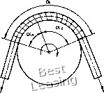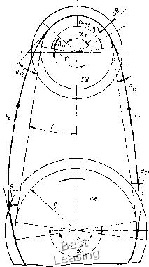 резерв нагрузочной способности, а для передачи данной нагрузки позволяет уменьшить предварительное натяжение против значений, определяемых зависимостью (57). Зависимость Понселе получена в предположениях: контур ремня имеет теоретическую форму, представленную на рис. 4, длина ремня при нагружении его остается неизменной - натяжения Fl и /3 распространяются каждое на половину длины ремня, и удлинение ведущей ветви под нагрузкой равно укорочению ведомой. В действительности натяжения /1 и /3 с определенным допущением распространяются только на дуги сцепления, на дугах скольжения деформации растяжения переменны. Вследствие различия длин этих дуг на обоих шкивах и изменения их при нагружении передачи суммарная деформация ремня не остается неизменной. При наличии изгибной жесткости ремня свободные ветви его непрямолинейны, и контур принимает форму, изображенную на рис. 27. По мере нагружения передачи отклонение ведущей ветви от прямолинейной уменьшается, а ведомой - увеличивается. Все это приводит к увеличению суммы натяжений ветвей с ростом нагрузки. На натяжение ветвей также влияет податливость валов и опор, а в клиноременной передаче - изме-нениезаглубления ремня в канавки шкивов при изменении нагрузки. Из-за изгибной жесткости ремня точки набегания и сбега ветвей отклоняются от своего теоретического положения (рис. 27) на углы жесткости 6, определяемые [69] по формуле ![]() Рис. 27. Действительный контур ремня при наличии изгибной жесткости cos е = 1 - С достаточной точностью углы жесткости (рад) можно определить по приближенной формуле (59а) Из зависимостей (59) или (59а) могут быть найдены углы жесткости 6о в покое при натяжении F, а также при работе бц, на ведущем и 631, 633 - на ведовом шкивах для ведущей и ведомой ветвей при натяжениях F и F. При входе ремня в канавку шкива его элемент (см. рис. 25, б) сжимается силой dF = dF„ cos -j- - dF sin --. Поперечное сжатие на угле входа ап будет dFxbcp ErhRda (60) (61) Радиальное перемещение на угле входа dFxbcp 2 tg 2EhR da tg Подставляя сюда выражение для dF и используя выражение (42) с учетом, что на этой дуге = /, получаем радиальное перемещение на всей дуге входа (2) =--Г = -ALZ , (62) 4ЗД (2)Ztg--tg (+р здесь Яс - приведенная податливость ремня, причем 4£etetgtg(--+p) • Угол входа согласно [53 ] определяется зависимостью / I (2) - 0>о где S = viRAR {2R + AR). (63) Углы выхода из канавок aei (2) устанавливаются аналогично, причем для обоих шкивов при определении AR по формуле (62) следует подставлять натяжение ведущей ветви F, так как оно определяет заглубление ремня в канавки обоих шкивов. В результате изгибной жесткости и поперечной податливости ремней теоретический угол обхвата «т, определяемый по формуле (10), изменяется (рис. 27) до а = а 2]е+а; + а;= 180 + 2 - 1,е+а;+а;. (64) при переходе от холостого хода к работе под нагрузкой углы жесткости у ведущей ветви уменьшаются, у ведомой - увеличиваются, углы входа и выхода увеличиваются, углы обхвата при этом уменьшаются на Аос = 01 + 02 - 200 + 2а;. ео - «п - «с. (65) где 6о, «п. со - углы жесткости, входа и выхода на холостом ходу. Практического значения величины Аа, т. е. уменьшения углов обхвата, приобретают при коэффициентах тяги \{) > 0,75, когда значительное падение натяжения ведомой ветви существенно увеличивает углы жесткости у этой ветви. Влияние нагрузки на сумму натяжений ветвей с учетом различий деформаций на дугах скольжения и сцепления было установлено Е. М. 