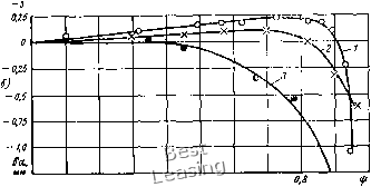 ![]() а,г e,f о,в Рис. 28. Характеристики передачи: а - изменение суммы натяжений ветвей при закрепленных валах; б - изменение межосевого расстояния при плавающем вале и F, + = = const: / -а„ = 4,8 кгс/см г -а» = 9,2 кгс/см; 3 - а„= 13,5 кгс/см Сп = оо: В передачах с плавающим валом Fi + F2 = 2Fxoл = = const, и влияние изгибной жесткости и заглубления ремня в канавке проявляются в виде изменения межосевого расстояния. С увеличением нагрузки оно вначале увеличивается, а затем сокращается (рис. 28, б). Как видно из рис. 28, с уменьшением предварительного натяжения Fo указанные явления проявляются сильнее и при а = const предельный коэффициент тяги возрастает больше. М. Т. Уразбаевым [90] и А. В. Андреевым [1] отмечено, что передача касательной силы в ременной передаче должна сопровождаться деформациями сдвигу ремня. Р. В. Вирабов [9] показал, что на дуге сцепления (покоя) происходит постепенное увели- 3 Б. А. Пронин и др. 65 чение наклона сечения плоского ремня депланация сечения (рис. 29). Элементы ремня, прилегающие к шкиву, на этой дуге движутся со шкивом без скольжения до тех пор, пока касательная сила не превысит силу трения покоя или пока деформация сдвига не достигнет определенной величины. В. К- Мартыновым [51] показано, что и в клиноременной передаче также происходит де-планация сечений, характер которой представлен на рис. 30. На дугах сцепления «„ депланация сечения нарастает. На дуге скольжения ai ведущего шкива по мере уменьшения натяжения ремня она уменьшается, а на той же дуге «сг ведомого шкива, наоборот, нарастает и снимается в момент сбега ремня. Дуги сцепления не являются пассивными - часть окружной силы передается на этих дугах, и тем больше, чем больше их протяженность [9], [51]. Этим объясняется то, что с увеличением диаметра шкива роль дуги сцепления увеличивается, а дуги скольжения уменьшается, что повышает тяговую способность. Согласно [51 ] с учетом тангенциальных деформаций уравнение Эйлера должно быть заменено зависимостями: для ведущего шкива ![]() Рис. 29. Депланация сечений плоского ремня на ведущем шкиве [9] (68) для ведомого («2 - «сз) (69) В этих зависимостях второе слагаемое в квадратных скобках характеризует долю окружной силы, передаваемой на дугах сцепления. Использовать зависимости (68) и (69) для практических расчетов передач пока затруднительно, однако основные положения теории с учетом деформаций сдвига хорошо объясняют ряд явлений, наблюдаемых при работе ременной передачи. Из формул (44) и (45) видно, что приведенный коэффициент трения на ведомом шкиве существенно меньше, чем на ведущем. Кроме того, из выражений (68) и (69) следует, что доля окружной силы, передаваемой на дуге сцепления, у ведомого шкива меньше. Оба эти обстоятельства пригодят ктому, что угол скольжения на ведомом шкиве оказывается больше и при передаточном отношении j -> 1, когда = «з тяговая способность лимитируется сцеплением ремня с ведомым шкивом, а не с ведущим. Многочисленные опыты показывают, что буксование имеет место в этом случае именно на ведомом шкиве. При расчете это обстоятельство приближенно следует учитывать, вводя разные приведенные коэффициенты трения fx и /г для того и другого шкива. 4.2. ОСЕВЫЕ СИЛЫ НА ШКИВАХ В клиноременных вариаторах необходимое натяжение ветвей ремня создается осевым воздействием пружин, кулачков или нажимных устройств центробежного типа, гидравлических, пневматических.