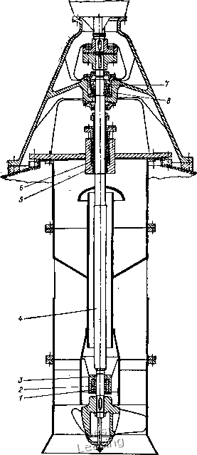 В результате проведенных испытаний текстолитовых подшипников с внутренним диаметром 25,4 мм, дДинОй 20 мм, с частотой вращения вала 670 об/мин и нагрузке на подшипник 5 кгс было установлено, что после 500 ч работы износ составил менее 0,08 г без изменения Линейных размеров [56]. Сравнительные испытания, на трение текстолита и полиамидных пластмасс на машине трения с граничной смазкой, проведенные Г. А, Гороховским [28], показали более высокую износостойкость текстолита, а также to, что пгластмассы на основе фенолоформальдегидных смол с небразивными наполнителями (текстолиты) являются одними йз лучших антифрикционных материалов. Допускаемый режим работы текстолита следующий: при трении без смазки Гр] 50 кгс/см, [v] == \,0 м/с, [/]=80Х, [pv] а= 10 кгс-м/(см2/с), / = 0,20,3, а со смазыванием [р] = = 100 кгс/см2, [v] =2 м/с, [] =100С, f = 0,06- 0,1. Текстолиты химически стойки к действию разбавленной соляной кислоты, к растворам уксусной и фосфорной кислот, к действию разбавленных щелочей,- Не стойки к действию концентрированных кислот и щелочей..Более подробно химическая стойкость текстолитов изложена в литературе [34]. Благодаря высокой химической стойкости широкое применение текстолитовые подшипники напали в химических аппаратах с перемешивающими устройствами для валов мешалок в качестве промежуточных и концевых опор, расположенных внутри аппарата и работающих со смазыванием реакционной средой или жидкостями, нейтральными по отношению к ней, а также без смазки. На рис. 34 показана мешалка с приводом метанольного про-мывателя полиэтилена. Промыватель предназначается для холодной промывки полиэтилена в метаноле после разложения катализатора. Давление в аппарате 0,01-0,03 кгс/см. Рабочая температура 20-30 °С, частота вращения вала 270 об/мин. В качестве перемешивающего устройства применена пропеллерная мешалка с диффузором. Среда, подлежащая перемети- ![]() Рис. 34. Мешалка с приводом: 1-втулка подшипника (текстолит); 2-обойма подтип ника; 3-втулка вала; 4-вал; 5-корпус сальника; б-саль- никовая набивка; 7-радиальный сферический роликоаоД-шианик; упорный шарикоподшипиик ванию содержит бензин, метиловый спирт, полиэтилен. Вал мешалки имеет две опоры: радиальную опору скольжения, выполненную из текстолита, установленную в направляющем аппарате непосредственно у колеса, и опору качения, установленную за сальниковым уплотнением. Центровка нижней опоры осуществляется тремя тягами с промежуточной резьбой, прикрепленными к корпусу аппарата (на чертеже не показаны). Все детали мешалки, соприкасающиеся с рабочей средой, выполнены ![]() Рис. 35. Внутренняя концевая опора вала реактора с перемешивающим устройством: / - стойка; 2-нижняя половина корпуса; 3 -верхняя половина корпуса; •-втулка вала; 5-втулка подшипника; б -сфера; 7 -кольцо; 8 -кольцо; Р-винт из коррозионно-стойкой стали 12Х18Н10Т. Текстолитовые подшипники могут быть использованы со смазыванием агрессивными средами, так как стойки при воздействии органических растворителей, масел, углеводородов, спиртов. Они могут быть установлены также в среде суспензии полиэтилена с остатками катализаторного комплекса в промывочном растворе, содержащем бензин, циклогексан, пропан, в растворе каучука в толуоле, в средах выращивания микроорганизмов и в других химических средах. На рис, 35 показана внутренняя концевая самоустанавливающаяся опора реактора для ва