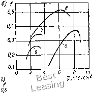 Изучение антифрикционных свойств и износостойкости композиционных материалов проводили на машине трения МИ-1М, переоборудованной для испытаний полимерных материалов. Испытуемый образец (плоская колодочка) закреплялся неподвижно. Вращающимся образцом служил ролик из стали ШХ15 Испытывали образцы без смазки и со смазыванием водой при скорости скольжения 1 м/с. Полученные зависимости коэффициента трения наполненного фторопласта-40 с различным содержанием наполыителя от давления без смазки представлены на рис. 38. Из графиков видно, что вначале при постепенном увеличении нагрузки на образец коэффициент трения растет до некоторого максимального значения, соответствующего допускаемому давлению. Дальнейшее повышение нагрузки приводит к увеличению износа и площади контакта образца, а коэффициент трения несколько снижается. Правые ветви кривых со- 0,5 ол 0,6 0.5 ОЛ 0,3 О Л