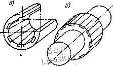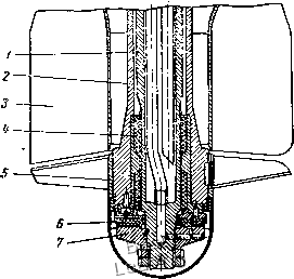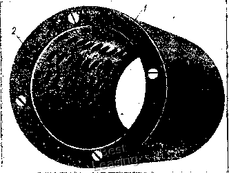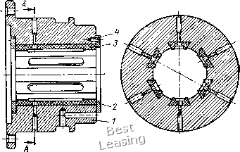жения. В верхней части привода закреплена неподвижная ось, на которой вращается ротор с насаженным на него перемешивающим устройством (рис. 50). В роторе внутри на каждом конце установлены подшипники скольжения. Осевая нагрузка воспринимается подпятником, закрепленным на нижнем хвостовике оси. Охлаждение и смазка подшипников скольжения производятся водой от автономного циркуляционного насоса с температурой 60-80 °С. Расход воды 0,5 м/ч. Результаты замеров ![]() Рис. 50. Перемешивающее устройство привода реактора на металлофт1ропластовых подшипниках: /-неподвижная ось; 2 -вращающийся пустотелый вал; 5 -неподвижный направляющий аппарат; 4 -вращающийся радиальный подшипник; 5 -винт; б-вращающаяся упорная пята; 7-подпятник ПОДШИПНИКОВ скольжения после испытаний привода показали износ 0,02-0,05 мм и отсутствие схватывания за 208 ч, полную надежность и работоспособность подшипников. Другая конструкция металлофторопластового подшипника с фторопластовыми вставками, выполненными в форме ласточкиного хвоста, представлена на рис. 51. Отличием ее кроме конфигурации вставок является индивидуальная подача воды в камеру, расположенную в центре каждой вставки, что повышает грузоподъемность подшипника, уменьшает расход смазывающей жидкости, улучшает условия теплоотвода. Втулка подшипника выполнена из нержавеющей стали 12Х18Н10Т. Конструкции подшипников с цилиндрическими фторопластовыми вставками [87] были использованы для насосов в условиях граничной смазки жидкими кислородом и азотом при крио- генных температурах (-183 и - 196°С). Фторопласт-4 инертен в жидком кислороде, а его механические свойства мало изменяются. Вязкость криогенных жидкостей низкая, и при реальных нагрузках и возможности кипения жидкости в подшипнике возникают условия граничного и сухого трения. Фторопласт же способен работать без смазки. Кроме того, он негорюч, а это свойство особенно ценно в кислороде. Многие материалы при трении в кислороде вызывают реакцию, идущую со скоростью взрыва, которая может создать аварийную ситуацию. Были ![]() Рис. 51. Металлофторопластовый подшипник с фторопластовыми вставками в форме ласточкиного хвоста: / - корпус подшипника (сталь 12Х18Н10Т); 2-фланец; 3 -фторопластовая вставка; 4-вннт исследованы подшипники с давлениями до 63 кгс/см2 и скоростями скольжения 0,33 и 1,33 м/с. Наряду с другими материалами (металлокерамика, углеграфит) для подшипников применялись фторопласт-4 и его композиция со стеклом и асбестом (50% по массе). Для валов использовались различные нержавеющие стали, свинцовистая и оловянистая бронза и другие материалы. Испытания показали, что как в жидком кислороде, так и в жидком азоте износ подшипников был мал, а повреждение валов незначительное. При низких температурах целесообразнее применять чистый ненаполненный фторопласт-4, так как любой наполнитель оказывает незначительное влияние на долговечность подшипника. В этих конструкциях втулка подшипника выполнялась из свинцовистой бронзы, которая не имеет склонности к схватыванию при местном износе выступающих участков вставок. На рис. 52 изображен испытанный подшипник для криогенных температур с цилиндрическими фторопластовыми вставками, расположенными перпендикулярно оси вала. Такой подшипник технологичен в индивидуальном производ* стве и смазывается жидкостью, попадающей в него чере