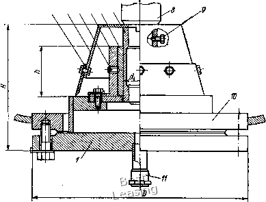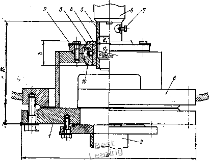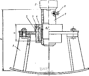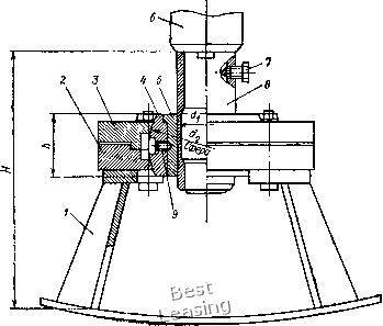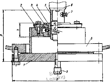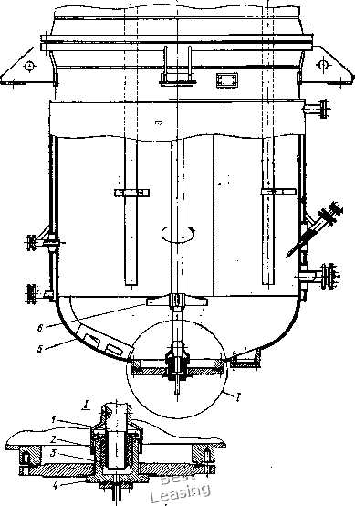 ![]() Рис. 91. Внутренняя цилиндрическая концевая опора (тип I): i-стойка: 2-корпус; Д-винт; 4-втулка подшипника; 5-вал; б-винт; 7-втулка вала ![]() Рис. 92. Внутренняя сферическая концевая опора (тип II): /-стойка; 2-нижнее кольцо; S-верхнее кольцо; 4-сферическая пята; 5-втулка подшипника; б-вал; 7-винт; в-Ьтулка вала; S-винт 2, 4. 5. 6. г ![]() Рис. 93. Наружная цилиндрическая концевая опора (тип III): / - фланец со стойкой; 2-фторопластовое уплотнение; 5-защитный колокол; 4-винт; 5-корпус; 5-втулка подшипника; 7-втулка вала; в-вал; 5-винт; /О-фланец днища; -штуцер ![]() Рис. 94. Наружная сферическая концевая опора (тип IV): i-фланец со стойкой; 2-направляющее кольцо; 5-сферическая пята; 4-втулка подшипника; 5-втулка вала; 5-вал; 7 -винт; в-фланец днища; 9-штуцер •Наружная опора (типы III, IV и V) состоит из фланца со стойкой, в которую установлена втулка подшипника. Фланец крепится снизу к днищу аппарата, имеющему отверстие для установки опоры. Благодаря разъемному соединению облегчается монтаж и демонтаж опоры, а также ее обслуживание в процессе эксплуатации,. Размещение штуцера во фланце опоры дает возможность подводить к ней извне смазывающую ![]() Рис. 95. Наружная сферическая,концевая опора со сливом (тип Y); 7-фланец со стойкой"; 2-направлаюшее кольцо; 3-сферическая Ьята; 4-втулка Ьодшипника; 6-втулка вала; 6-вал; 7-лннт; 8-фланец днища; 9-сливной трубопровод; W-винт жидкость, В ТОМ числе при температуре в аппарате выше 80 °С, являющуюся одним из компонентов рабочей среды или нейтральную по отношению к рабочей среде с температурой не выше 40 °С и давлением не менее чем на 0,5 кгс/см выше давления в аппарате. После монтлжа наружной опоры и ее установки относительно вала производится фиксация соединительных фланцев штифтами, а при работе аппарата с токсичными и взрывоопасными средами допускается применение соединитель-ньк фланцев с уплотнительной поверхностью типа шип - паз. Основные размеры концевых опор даны в табл. 49. Концевые подшипниковые опоры, показанные на рис. 93, 96, предназначены для абразивосодержащих рабочих сред. Защитные свойства конического колокола (рис. 93) заключаются в отбрасывании ![]() Рис. 96. Аппарат с концевой наружной опоройт i -вал; i -втулка подшипника; втулка вала;. 4-корпус подшипника; У-дишЦ» аппарата; б-мешалка