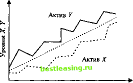 ными, которая может использоваться в свете практических реалий того, что ряды, не будучи совместно ковариационно стационарными на коротком промежутке времени, демонстрируют долгосрочное равновесие. Это понятие соответствует коинтеграции. Коинтеграция описывает долгосрочную линейную связь между несколькими переменными, которые демонстрируют равновесное отношение друг с другом. Рассмотрим пример с двумя переменными, например, уровень индекса FTSE 100 и курс фьючерсов FTSE 100, которые обозначим соответственно как Хи. Y. Есть экономические причины полагать, что в долгосрочном плане они будут иметь равновесную связь друг с другом. Чтобы понять это, рассмотрим модель арбитража наличного и фондового рынков, введенную в гл. 1, для объяснения ценообразования финансовых фьючерсов. Что произойдет, если цена фьючерса будет намного выше или ниже теоретического уровня? Если цена фьючерса выше справедливой, то арбитражеры будут продавать фьючерсы и покупать индексы, тем самым опуская цену на фьючерсы до равновесного уровня. И наоборот, если цена фьючерса ниже справедливой, то арбитражеры будут продавать индексы и покупать фьючерсы. Предположим, что равновесное отношение уровня цены на фьючерс к уровню индекса равно 1,1. Это можно выразить так: Y=\,\X, (7.30) но можно представить и так: К- 1,1 ЛГ- 0. (7.31) Это соотношение верно только для равновесия, на краткосрочных интервалах каждая из этих переменных будет изменяться по-своему и, возможно, будет являться рядом 7(1). Но даже если оба ряда относятся к 7(1), если существует долгосрочное равновесие между ними, то третья переменная z, заданная как Y- 1,1*= г, (7.32) будет стационарной и будет измерять, в какой степени переменные X и Y выведены из равновесия. Переменную z называют ошибкой равновесия, потому что под действием тех сил, что устанавливают равновесие, она устремится к своему среднему значению. Таким образом, если существует равновесное отношение, то возможно найти такую комбинацию данных двух переменных, т.е. aY + ЬХ = z, при которой z будет стационарной. Как выше уже говорили, если z в самом деле стационарна, то ее значение колеблется вокруг постоянной средней, и если z отклоняется от своего среднего значения, то имеет тенденцию возвращаться к нему. Однако на краткосрочных интервалах переменные могут и не изменяться вместе и, таким образом, может не быть краткосрочного равновесия, но-все краткосрочные отклонения будут сводиться рыночными силами в долгосрочном плане к нулю. Это показано на рис. 7.9. Равновесное отношение ![]() Время Рис. 7.9 Если существуют такие а и Ь, что aY + ЬХ является 7(0), то у + + (Ь/а)Х будет стационарно. Если мы имеем функцию Y+ $Х= z, где z стационарна ии У являются 7(1), то имеется коинтеграция между X и Y. В часто называют коэффициентом коинтеграции. Таким образом, коинтеграция описывает долгосрочное соотношение двух или более переменных и проистекает из того, что эти переменные демонстрируют общий стохастический тренд во времени. Одна из задач анализа коинтеграции состоит в анализе преимуществ от диверсификации портфеля в дополнение к корреляционному анализу структуры портфеля с точки зрения его математического ожидания и дисперсии. В частности, анализ коинтеграции позволяет выявить существование долгосрочной зависимости между переменными и скорость, с которой краткосрочные отклонения от долгос