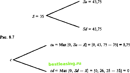 Определение стоимости на момент исполнения Никто не станет платить за опцион на покупку актива больше, чем разница между тем, что нужно заплатить для покупки актива на рынке, и тем, что нужно заплатить по опциону, т.е. ценой исполнения. Следовательно, верхний предел стоимости опциона на покупку - это цена самого актива минус цена исполнения. В случае опциона на продажу актива никто не будет платить за этот опцион больше, чем разница между ценой, по которой актив может быть продан на открытом рынке, и ценой, по которой этот актив будет продан по опциону. Следовательно, верхний предел стоимости опциона на продажу - это цена исполнения минус текущая стоимость актива. Так как владелец опциона может отказаться от него без последующих обязательств, цена на опцион не может быть отрицательной. Значит, нижний предел цены для опционов обоих типов - это нулевое значение. Эти ограничивающие условия формально могут быть выражены следующим образом: С = max [0,5 - Х\, (8.22) Р = тах [0,Х- S). Выражение (8.22) определяет стоимость опциона на момент исполнения. К настоящему времени разработан ряд моделей ценообразования опционов на срок их действия (до момента исполнения). Наиболее широко встречающаяся модель - это модель, разработанная Блэком и Сколсом (1973), которая использует непрерывные временные стохастические исчисления для нахождения стоимости, она будет рассмотрена в гл. 10. Наиболее известная дискретная временная модель - это биномиальная модель, разработанная Коксом и другими (1976), а также Рендельмэном и Бартером (1979). В последнее время также возрастает интерес к триномиальным моделям. В этом разделе мы обсудим биномиальные и триномиальные модели в приложении к ценообразованию опционов. Биномиальные модели Эти модели предполагают, что основная случайная переменная (цена ценной бумаги, лежащей в основе опциона) характеризуется биномиальным распределением, которое было обсуждено в гл. 4. Применение биномиальных моделей к ценообразованию опционов подразумевает моделирование цены актива, лежащего в основе опциона как биномиального процесса, будь то цена ценной бумаги, обменный курс или процентная ставка, для определения распределения этой переменной на момент исполнения. Затем с использованием приведенных выше ограничивающих условий, определяется будущая стоимость опциона и дисконтируется к настоящей, определяя, таким образом, текущую цену на опцион. Биномиальная модель допускает возможность создания безрискового портфеля посредством хеджирования длинной позиции по активу короткой позицией по ряду справедливо оцененных опционов по покупке этого актива. Следовательно, только безрисковая процентная ставка должна быть использована для дисконтирования, поскольку предполагается, что если портфель захеджиро-ван наилучшим образом, он будет безрисковым и, следовательно, должен характеризоваться безрисковой процентной ставкой. Далее продемонстрируем два подхода. Первый, и наиболее популярный - построение биномиальной решетки или дерева, второй подход - использование биномиальной алгебры для получения суммы текущих стоимостей кажлой вероятностно взвешенной будущей стоимости опциона. Оба эти подхода предварительно были представлены в гл. 4. Биномиальная решетка Стоимость создания безрискового портфеля - это стоимость покупки основного акт