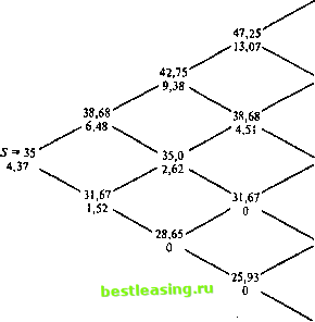 52,21 с = max [0, Su* - Х] = max [0, 52,21 - 35] = 17,21 :42,75 с = max (0, Stfd - X] = max [0, 42,75 - 35] = 7,75 с = max [0, Sied - X] = max [0, 35 - 35] = 0 28,66 с = max [0, Su3d - X] = max [0, 28,65 - 35] = 0 23,66 с = max [0, S*d - X] = max [0, 23,46 - 35] = 0 Рис. 8.10. Биномиальная модель опциона на покупку Этап 1: использование стоимостей на момент исполнения для расчета стоимостей третьего периода На биномиальном дереве видно, что возможные стоимости опциона равны 17,21; 7,75; 0; 0 и 0. На основе этой информации мы можем рассчитать стоимости опциона на конец третьего временного периода. Прежде всего, вспомним, что и, d и R были изменены с целью учета четырехпериодности этой модели: и = 1,10517, d = = 0,904837 и R = 1,024. Следовательно, р будет равно (1,024- - 0,904837)/(1,10517-0,904837) = 0,59539, а \-р становится (1,10517- 1,024)/( 1,10517-0,904837) = 0,40461. си3 = [реи* + (\-р)сигЩ/Я = ![]() =1,10517 d = 0,904837 Л = 1,024 р = 0,59539 !-/? = 0,40461 S= 35 Х= 35 = [0,59539 17,21 + 0,40461 7,751/1,024 = = [10,25 + 3,14]/1,024 = 13,07. Аналогичным образом мы можем вычислить стоимость опциона для cu2d: cu2d = [0,59539 7,75 + 0,40461 0]/1,024 =4,51. Нет необходимости рассчитывать какие-либо значения для других узлов, так как соответствующие величины четвертого периода были равны нулю. Этап 2: использование стоимостей третьего периода для расчета стоимостей второго периода Зная, что си3 = 13,07, a cu2d = 4,51, мы можем рассчитать значения для соответствующих узлов на конец второго временного периода следующим образом: си2 = [реи3 + (1 -р)сиЩ/1,024 = [0,59539 13,07 + 0,40461 4,511/1,024 = 9,38, cud = \pcu2d + (1 -p)cud2)/1,024, так как cud2 равно нулю, то cud = [0,59539 4,51 + OJ/1,024 = 2,62. Этап 3: использование стоимостей второго периода для расчета стоимостей первого периода Мы можем найти си и cd следующим образом: си = [0,59539 9,38 + 0,40461 2,621/1,024 = 6,48, cd = [0,59539 2,62 + OJ/1,024 = 1,52. Этап 4: использование стоимостей первого периода для расчета текущей иены опипона Наконец, мы можем определить текущую цену опциона следующим образом: с =[0,59539 6,48 + 0,40461 1,521/1,024 = 4,37. В гл. 4 мы определили, что ожидаемое будущее значение переменной - это сумма различных возможных будущих значений, помноженных на соответствующие вероятности. Следовательно, мы можем использовать биномиальное вероятностное уравнение из гл. 4 для определения стоимости опциона на покупку путем расчета ожидаемой стоимости актива, превышающего цену исполнения опциона на момент окончания его срока действия , и дисконтирования этой величины к настоящему моменту. Для определения стоимости опциона на продажу необходимо рассчитать ожидаемую стоимость актива ниже цены исполнения опциона. Приведем общую биномиальную формулу для оценки опциона. Для опциона на покупку: С = -j)\j]pJ(-1 P) ~Jmaxl°>uJd ~Js - *l) /(1 + Пп. (8.34) Для опциона на продажу: Р = Y{-Pj(I- p)n~Jтгх[й,Х-uU ~JS]]/(\ + ,) , (8.35) где p и 1-p - описаны ранее, n - общее количество биномиальных испытаний, j - количество произошедших движений вверх, a n-j - количество произошедших движений вниз. Вспомним, что четырехуровневое биномиальное дерево (рис. 8.10) имеет пять возможных исходов. Si/ достигается по еле четырех повышений, стоимость опциона - 17,21 на момент исполнения; Sud - после трех повышений и одного понижения цены, стоимость опциона на момент окончания срока действия - 7,75; Su2d2 - после двух повышений; Sud3 - после одного повышения, a Sd4 - при отсутствии повышений. В каждой из последних трех ситуаций стоимость опциона на момент исполнения нулевая. Следовательно, для определения стоимости Европейского опциона необходимо выполнить следующие три шага: 1. найти биномиальную вероятность для каждого из результатов на момент окончан