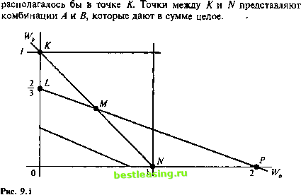 OWl (все активы должны иметь неотрицательные веса) (9.10) OWl 3. Wa + Wb+ Wc= \ (средства должны быть полностью инвестированы) (9.11) Заметьте, что все ограничения линейны (т.е. нет величин во второй или более высоких степенях) и одновременно присутствуют ограничения в виде равенств и неравенств. Мы продемонстрируем приложение линейного программирования, показав, как вышеозначенная задача решается сначала графически, а затем симплексным методом. Графическое решение Для иллюстрации графического решения мы используем третье ограничение, чтобы исключить Wc и тем самым получить задачу с двумя переменными. Это возможно, потому что в каждой портфельной задаче, где средства полностью инвестируются в портфель, если мы знаем я-1 весов, то можно определить л-ный вес. Так как все веса должны в сумме дать единицу, то л-ный вес равен Заметьте, что этот переход от трех к двум переменным происходит только по причине облегчения графической демонстрации метода. Задача в том виде, в котором она была сформулирована, будет скорее всего передана ЛП - пакету в ее первоначальной форме - преобразования, сокращающее число переменных, обычно не проводятся. Используя ограничение Wa + Wb + Wc = 1 для замены Wc на \-Wa-Wb, переопределим целевую функцию: максимизировать 0,11 Wa + 0,15 Wb + 0,08( 1 - Wa- Щ = 0,03 Wa + 0,07 Wb + 0,08 (9.12) 1 Wa + \,lWb + 0,9(1-И/-И/6) * i,i 0 <, Wa 1 (9.13) 0<L\Vb<L\ Если считать вес актива С как остаток, мы можем максимизировать следующую целевую функцию: Когда мы найдем оптимальные веса для А и В из этой функции, мы сможем вычесть сумму этих весов из целого и найти вес актива С. Заметьте, что +0,08 является константой. Как таковую нам не нужно включать ее в функцию для максимизации, потому что, если мы найдем значения Wa и Wb, которые максимизируют 0,03 Wa + 0,07 Wb, то найдем и значения, максимизирующие 0,03 Wa + 0,07 Wi, + 0,08. Поэтому, как только мы максимизируем 0,03 Wa + 0,07 Wb, то сразу же следует прибавить константу 0,08. Так как мы заменили выражение для С в целевой функции, необходимо сделать то же самое и с ограничениями. Следовательно, ограничения становятся следующими Заметьте, что как и в целевой функции, мы удалили величину В актива С из В активов А и В. Мы также устранили влияние В актива С на максимальное В портфеля. При нахождении графического решения (рис. 9.1) мы стремимся определить область возможных решений между двумя осями, которыми в данном примере являются Wa и W По второму ограничению максимальная пропорция, которую мы можем инвестировать в А, составляет 100% или единицу. Это показано точкой N. Аналогично точка А отражает 100% портфеля, инвестированные в актив В. Так как и Wa, и Wb должны быть меньше или равны единице, вертикальная и горизонтальная линии проходят через соответствующие оси. Однако эти ограничения перекрываются тем, что требуется, чтобы Wa + Wb было меньше или равно единице. Чтобы понять расположение этого ограничения, допустим, что 100% инвестировано в А и ничего в В, тогда ограничение будет находиться в точке N. Если бы 100% было инвестировано в В и ничего в А, ограничение максимизировать 0,03 и/ + 0,07%. (9.14) 0,1 И/, + 0,3WU 0,2 0< Wa< 1 0< Wb<, 1 0 И/ + Wb< 1. (9.15) ![]() И наконец, существует ограничение 0,1 W, + 0,3W0,2. Для его иллюстрации мы проводим линию 0,1 Wa + 0,3 Wb = 0,2. Она представляет границу между областью точек, удовлетворяющих 0,1 Wa + 0,3Wb < 0,2, и областью, определяемой 0,1 Wa + 0,3 Wb > 0,2. Чтобы иметь правильное представление о расположении этой линии, предположим,