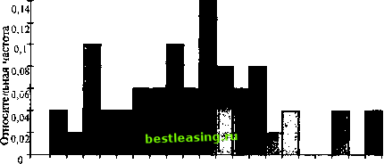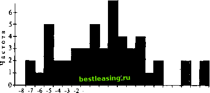 ![]() -1 0 1 2 3 4 5 6 7 8 9 10 11 12 Доходы Рис. 2.1. Распределение частот месячных доходов по индексу FTSE 100 с сентября 1989 г. по декабрь 1993 г. ![]() -8 -7 -6 -5 -4 -3 -2 8 9 10 11 12 -1 0 1 2 3 4 5 6 7 Доходы Рис. 2.2. Распределение относительных частот месячных доходов по индексу FTSE 100 с сентября 1989 г. по декабрь 1993 г. График распределения накопленных частот, или огива Для построения графиков распределения накопленных частот накопленная частота откладывается по вертикальной оси, а величины интервалов - по горизонтальной. Высота каждого столбика представляет распределение отдельных изменений доходов. относительное Огивы строятся нанесением на ось абсцисс данных в возрастающем порядке, и в случае сгруппированных данных нанесением частот напротив верхней границы интервала. Это проиллюстрировано на рис. 2.3. Гистограмма Следующим шагом в представлении относительного распределения будет его отображение не высотой, а площадью столбиков. Данное графическое представление известно как гистограмма. Для иллюстрации построения гистограммы рассмотрим следующие сгруппированные данные: