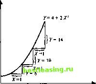 Теперь обратимся к случаю, когда функция не является линейной. Например, рассмотрим функцию Y - 4 + 2Х2. Значения Упри различных значениях Xприведены ниже: X 0 12 3 4 Y4 6 12 22 36 График функции изображен на рис. 3.2. Важное свойство этой кривой состоит в том, что она становится круче с увеличением значения X. Другими словами, У возрастает с растущей скоростью по мере того, как X увеличивается, даже если X возрастает с постоянной скоростью. Таким образом, угол наклона графика функции, или скорость изменения, не постоянна. 36 32 28 24 20 16 12 12 3 4 Рис. 3.2 Очевидно, что невозможно построить прямоугольный треугольник с гипотенузой, являющейся частью кривой. Тем не менее, представим себе прямоугольный треугольник, построенный между двумя точками на графике функции, как показано на рис. 3.2. Отношение AY/АХ теперь не дает действительной или моментальной скорости изменения У в любой из точек на участке кривой. Вместо этого мы получаем среднюю скорость изменения. Эта средняя тем менее будет репрезентировать степень изменения в определенный момент, чем больше расстояние между двумя точками на кривой. И наоборот, чем меньше это расстояние, тем более точно будет измерена скорость изменения У. Когда расстояние между двумя точками становится меньше и меньше, оно ![]() становится бесконечно малым, или близким к нулю. В таком случае математики говорят, что оно приближается к предельному значению, к пределу. Пределом является изменение значения Y в ответ на бесконечно малое изменение X. Чтобы показать это предельное изменение, математики заменили обозначение AY/АХ, когда Xприближается к пределу, на dY/dX. Теперь нам ясно, что для того чтобы найти моментальное изменение скорости, мы должны рассчитать dY/dX. Но как это сделать? Чтобы понять это, рассмотрим функцию Y = X2. Теперь предположим, что X изменяется на незначительную величину ЪХ. Для сохранения равенства К также возрастает на 5 К Таким образом, для функции Y= X2, У+ЪУ=(Х+ЬХ)2. (3.1) Раскрыв правую часть, получим (Х + 5Л)2 = (Х+ 5Х) (Х+ЬХ) = = XX + Х-ЪХ + Х-ЪХ + 5Х-5Х = X2 + 2(Х-8Х) + 5 X2 . Таким образом, Y+ 8У= X1 + 1(Х-ЪХ) + (ЪХ) 2. (3.2) Нам нужно найти значение dX Так как Y= X2, можно убрать Y из левой части уравнения и Л2 из правой, сохраняя при этом равенство. Получаем: ЬУ=2(Х-8Х) + (ЬХ)2. (3.3) Поскольку предел dX бесконечно мал, почти равен 0, то умножение dX2 на dX дает еще меньшую величину, еще более близкую к нулю. Таким образом: 8У=1(Х-8Х). (3.4) Теперь разделим обе части уравнения на бЛи получим предел ~-=2Х. (3.5) Так, для функции Y= X2, dy/dA= IX. Таким образом, чтобы найти diydA, мы просто умножим А на число, равное степени, в которую X был возведен, и затем уменьшим значение показателя степени на единицу, т.е. X2 становится 2-Х1. Это можно представить в общем виде для функции Y - X так: АУ/оХ=пХ-1. (3.6) Применяя это к упомянутой выше функции У = 4 + X2, получаем dY/dX = 1-1 Xх = 4Х. (3.7) Заметьте, что свободные члены исчезают при дифференцировании. Поскольку мы уже видели ранее на рис. 3.1, что свободный член не влияет на наклон графика*функции, то можем сказать, что скорость изменения Уне зависит от значения свободного члена. Теперь, рассмотрев основные принципы дифференцирования, мы можем вывести основные правила дифференцирования. Нахождение производных от константы 1. Для функции У = a AY/AX = 0. (3.8) В этом случае У равен константе а, которая по определению не может изменяться. 2. Для функции У= ЪХ d У/АХ = Ь. (3.9) В этом случае У увеличивае