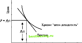 16. Если Y = loge является натуральным логарифмом более сложной функции от X, скажем Y - log(A? + IX2), то примем и за (Х$ + 2Х2), таким образом, Y = loge( ). Теперь мы найдем du/dX и затем dY/dX как (dY/du)-(du/dX). Тогда dY/du будет равняться: 1 1 * 1 d Y/du = - = -=-i-5-. - (3.23) и X3+2X2 Мы знаем, что du/dX = ЗХ2 + АХ, тогда Вторая производная До сих пор мы рассматривали первую производную функции, которая позволяет найти скорость изменения функции. Чтобы определить, является ли скорость изменения постоянной, следует взять вторую производную функции. Это обозначается как d2 Y/dX2. Чтобы взять вторую производную функции, мы всего лишь должны продифференцировать первую производную ее. Так, например Y- 4 + IX2. Первая производная будет dY/dX=4X. Вторая же производная будет производной от 4ДГ, те. 4. Разложение рядов Тейлора Зачастую бывает полезно приблизиться к какой-либо функции, используя более простые функции. Разложение рядов Тейлора предоставляет нам методологию для аппроксимации. Например, рассмотрим цену двухгодичной облигации, по которой ежегодно производятся выплаты по купонам. Цена облигации Р как функция от совокупной доходности (у) будет следующей: . CFX CF2 l+y) (i+y)2 В графическом виде эта функция известна как кривая цены-доходности и схематически изображена на рис. 3.3. Функция fly) достаточно сложная и еще более усложняется по мере того, как увеличивается по облигации количество платежей к получению. Было бы значительно проще, если бы мы имели приближение к функции fly). Аппроксимации рядов Тейлора являются многочленными выражениями (произведениями чисел и степеней у), которые делают возможным подобные приближения. Так, мы можем построить постоянные, линейные, квадратичные или кубические аппроксимации, а также четвертой степени, пятой, и т.д. По своей природе аппроксимации обычно имеют силу только на протяжении ограниченных интервалов значений аргумента (у - в данном случае). Мы свободны выбирать любую точку для аппроксимации /, обозначим ее у. Выбрав точку, зафиксируем ее и рассмотрим точки, которые влекут за собой бесконечно малые изменения у, скажем, у + h. Здесь h является бесконечно малой величиной и может быть отрицательной. Таким образом, h - это переменная. Ниже приведен перечень аппроксимаций рядов Тейлора для fly) в окрестностях точки у. Приближение к константе мы обозначили Ро(у), линейное приближение - Р\(у), квадратичное - Р2(у) и тд. ро(У + )=АУ) Р2(У + h) =ЛУ) + Лу)-А + у 2 (3-24) Р3(У + h)=fly)+f(y)h+ Цр--И>+ £--п3 Р*Ь> + h)=fly)+f(y)h + Цр--п2+ £p--h?+ Заметьте, что / (у) - это третья производная fly) при у = у, fviy) - четвертая производная при у = у. Также заметьте, что 2, 6, 24 и т.д. являются факториалами: 2! = (21), 3! = (3-2-1), 4! = (4-3-2-1) и т.д. Нет никакого смысла искать, какая аппроксимация является лучшей линейной или лучшей квадратической и т.д. Они построены таким образом, что Pq имеет то же самое значение в точке у, что и Pi, и такое же значение производной, Р2 имеет то же самое значение и такую же первую и вторую производные, и т.д. Как следует интерпретироватьэти аппроксимации? Рассмотрим рис. 3.3. Высота fly) дает нам точку на линии, равную Р. Теперь для приближения Р = fly), когда у изменяется на малую величину, мы могли бы добавить линейное приближение. Это будет: Р = fly + И) - fly) + hf(y). Будучи линейным приближением, изменение в значении Р будет приблизительно равносильно движению вдоль прямой линии, а не кривой. ![]() О у Доходность Рис. 3. 3. Кривая цена-доходность обли