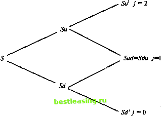 правой части уравнения будет нормально распределена, и соответственно ln(i5y S/-i) будет тоже нормально распределено. Переменная называется логнормально распределенной, если натуральный логарифм ее нормально распределен. Следовательно, если \n(Sl+itt/S(f)) нормально распределен, то St+it/S должно быть распределено логнормально. Это очень привлекательная модель распределения отношений цен ценных бумаг, потому что, если цена растет, то отношение цен будет больше единицы, если падает - то отношение цен будет меньше единицы, но оно никогда не принимает отрицательного значения. Теперь рассмотрим график функции логнормаль-ного распределения на рис. 4.7. На рисунке видно, что логнормальное распределение вытянуто вправо, но не имеет отрицательных значений. Это совместимо с возможным распределением цен ценных бумаг, поскольку они не могут упасть ниже нуля, и только очень немногие из наблюдений могли быть очень высоки. ![]() Рис. 4.7 Переменная не может принимать отрицательные значения, и вероятность очень высоких значений приближается к нулю, как это и можно ожидать от переменной, описывающей относительное изменение цены ценной бумаги. Логнормальное распределение очень часто используется для моделирования такого рода случайных переменных, в основе которых лежит процесс умножения. Мы отметили в гл. 1, что натуральный логарифм относительной цены ln(St/St i) - это непрерывно начисляемая доходность ценной бумаги S за период времени t- (t- 1). Если относительные цены логнормально распределены, непрерывно начисляемая доходность ln(St/St-i) будет также логнормально распределена. К этому распределению мы вернемся в гл. 10, где используем его для оценки опционов. Следующие результаты доказаны в приложении к этой главе. Если- * Ыг)~ЛГ(ц,о-2), (4.31) Дг) =еМ+ 2 . (4.32) Для удобства это часто записывается так: ехр(ц + о72); (4.33) var( Y) = е2**+°2 (е°2 -1). (4.34) Биномиальное распределение Одним их наиболее важных дискретных распределений в финансах является биномиальное распределение. Для формирования биномиального распределения случайная переменная должна отвечать следующим четырем условиям. 1. Переменная может принимать только два значения в данный момент или в результате данного события. Каждое из этих событий или моментов времени называется биномиальной попыткой. Два возможных результата называются успех - в случае благоприятного результата и неудача - в случае неблагоприятного. 2. Для каждой последовательности попыток вероятность успеха и неудачи постоянна. 3. Все попытки идентичны. 4. Все попытки независимы. Биномиальная случайная переменная X - это число успехов в результате некоторого количества независимых попыток п. Результат испытания записывается как успех или неудача, и вероятность успеха в каждой из попыток равна р. Мы говорим АЧжном (я, р). X, число успехов в я попытках, может принимать значения 0, 1, 2, я. Таким образом, для я попыток может быть я + 1 результат. Один результат будет включать я успехов, другой - я-1 успехов, и т.д. и последний - вообще без успехов. Это показано на рис. 4.8, где переменная S может возрастать в и раз (м >1) или уменьшаться в d раз (0 < d < 1). В данном случае мы имеем две биномиальные попытки и три результата. Результат Su2 - это результат двух успехов, т.е. j = 2. Результат Sud = Sdu, т.е. j = 1 - это результат одного успеха. И результат Sd2 - это результат нулевого количества успехов, т.е. 