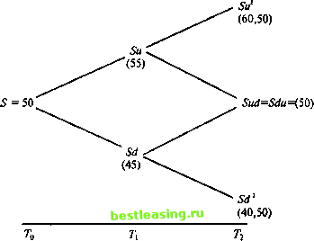 способа достижения одного успеха. Каждый способ имеет вероятность 0,25, и значит, вероятность результата у = 1 будет 0,25 + + 0,25 = 0,5. Для нахождения вероятности в более сложных примерах, например, если вероятности роста и падения не равны или очень много попыток, необходима Азнать количество результатов, имеющих определенное число успехов. В рассматриваемом примере мы хотим узнать, сколько результатов соответствуют одному успеху, сколько - двум и сколько - нулю. Можно рассчитать число у - количество успехов для заданного числа я биномиальных попыток, используя формулу: Cj = . й! (4.35) где Cj - количество способов достижения у успехов из я попыток; и - число биномиальных попыток; у - число успехов. Знак ! после я и у обозначает факториал, т.е. п умножаем на (и - 1) (я-2) (я - 3) и т.д. Например, для я = 4 найдем я! 4 3 2 1 = 24, у! рассчитывается подобным же образом. Для демонстрации использования формулы (4.35) определим число способов получения одного успеха в данном примере: 2! 2-1 2 1!(2-1)! 11 Этот результат можно легко проверить. В рассматриваемом примере Sud и Sdu приводят к одному успеху каждый. Теперь, зная число результатов с у успехами, определим вероятность получения у успехов с л попыток, поскольку это даст нам вероятность, связанную с количеством результатов, имеющих у успехов. Эта вероятность находится по формуле p{x = j) = jKn-jy.pJ(l~p)(, J) (4,36) где р - вероятность успеха и 1-р - вероятность неудачи. Для примера вспомним, что мы предположили, что р = 0,5 и (1 - р) = 0,5. Вероятность конкретного результата (Su2) после двух попыток отсюда равна: piSu2)= 2\(2-2)!0,52(1 -05)(2 2) =о,25 = ОД5. Таким образом, существует всего лишь один результат cj=2 числом успехов, и он имеет вероятность 0,25. Теперь рассчитаем вероятности Sud и Sd2 Для Sud P(Sud) = vJ[lv0f (1 - О.б)2 1 = 0,5. Существуют два результата, дающих j = 1 успеху, каждый имеет вероятность 0,25. Два таких результата имеют вероятность 0,5. Для Sd2 Р(Ы2) = -05° (1-05)V-V =0,25. 0!(я-0)! Складывая все полученные вероятности, получаем единицу, как и следовало ожидать. Математическое ожидание, дисперсия и среднее квадратическое отклонение распределения составят: Е(Х) = пр; Var(A) = пр(\-р); SD(X)=J(np(l-p)) . В случае же большого числа наблюдений биномиальной случайной переменной, где значение математического ожидания не приближается ни к нулю, ни к п, распределение вероятностей приближается к нормальному распределению со средней и дисперсией, соответственно равными Е(х) = пр; о\=пр(\-р). (4.37) Биномиальное пепево иен активов Наиболее частое применение биномиального распределения в финансах - это в отношении изменений цен ценных бумаг, где допускается, что в течение следующего малого промежутка времени цена может либо возрасти ( успех ), либо упасть ( неудача ) на определенную величину. Биномиальная модель используется как допущение при определении цены опционов. Расчет ожидаемого значения цены актива с применением биномиальной модели состоит из трех шагов: создание биномиального дерева возможных цен активов; определение вероятностей каждого из возможных результатов; умножение каждого из возможных результатов на его вероятность. Сумма произведений и составит ожидаемое значение. Например, рассмотрим случай, когда надо найти значение цены актива по истечении двух временных интервалов, т.е. после двух биномиальных попыток. Допустим, что в результате каждой попытки существует вероятность роста цены, равная 0,5 (т.е. р = 0,5)