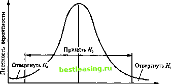 приближенно распределена как X ~ N(\i, s/n). Так как форма нормального распределения зависит от величины средней арифметической и среднего квадратического отклонения, следует привести переменную к стандартизованной форме перед сравнением. В случае проверки гипотезы о величине средней приведение к стандартизованной форме осуществляется следующим образом: 2-. (5.18) Эта величина называется стандартизованным критерием проверки (standardized test statistic). Если X равно ро, т.е. гипотеза Я0 верна, критерий проверки имеет стандартизованное нормальное распределение (если объем выборки большой) или стандартизованное /-распределение с и-1 степенями свободы (для малой выборки). Оба эти распределения имеют значения средней, равные нулю, и стандартную ошибку (так как они относятся к выборочным распределениям), равную 1. Приведя критерий проверки к стандартизованной форме, можно сравнить его значение напрямую со значениями, относящимися к соответствующим стандартизованным распределениям вероятностей. Если критерий проверки, полученный в результате стандартизации, расположен в критической области распределения, это доказывает, что средняя X не равна цо> те- наше предположение неверно и Щ ложна. Смысл сказанного заключается в том, что если критерий проверки находится в критической области, это событие маловероятно согласно нашим допущениям. Однако, как выше доказано, если такое событие произошло, мы должны подвергнуть сомнению принятые допущения. Проверка гипотезы может быть односторонней (one-tailed test) или двусторонней (two-tailed test). Односторонний критерий используется в тех случаях, когда необходимо знать, является ли параметр генеральной совокупности строго больше (правосторонний критерий) или строго меньше (левосторонний критерий) предполагаемого значения. Гипотезы (5.16) и (5.17) будут проверяться с помощью односторонних критериев. Двусторонний критерий приложим к тем случаям, когда нас интересует, отличаются ли реальные значения параметра от предполагаемого значения. Например, гипотезы, представленные выражением (5.15), проверяют с помощью двустороннего критерия. Критическую область (critical region) составляют те значения выборочных статистических показателей, которые ведут к отказу от нулевой гипотезы. На рис. 5.4 критическая область представлена граничными площадями под кривой. ![]() -1,96 ц +1,96 Рис. 5.4 Уровень значимости (significance level) гипотезы - это вероятность того, что критерий проверки находится в критической области при условии верности гипотезы Hq - обычно равен 5 или 1%. Если проверка при 5%-ном уровне значимости приведет к отказу от гипотезы Щ, то говорят, что величина критерия значима. Если Щ отвергается при 1%-ном уровне, используется термин высокий уровень значимости . Концепция критической области и уровня значимости может быть проиллюстрирована с помощью рис. 5.4, на котором изображен доверительный интервал для средней. Критические области составляют площади под кривой, находящиеся левее -1,96 и правее +1,96. Доверительный интервал - это площадь под кривой, находящаяся между этими двумя точками. Если X превосходит в положительном или отрицательном направлении 1,96 стандартной ошибки от цо, значит X настолько велика (или мала) по сравнению с предполагаемой цо, что существует очень малая вероятность (отражаемая площадью в граничных областях), что средняя арифметич