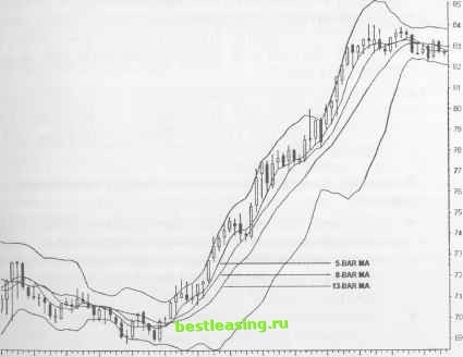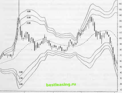 РИСУНОК 2.10 Стандартное отклонение показывает, как далеко может уйти цена до разворота. Полосы Боллинджера (ВВ), установленные на 20-периодные средние скользящие и двойное стандартное отклонение, огораживают большую часть колебаний в пределах своих границ. Но, когда волатиль-ные акции начинают пересекать эти границы, вступает в силу 3 std dev. Это - своего рода приспособление для высокой волатильности рынка работает в большинстве параболических рынков. Daily (Right) CMRC - COMMERCE ONE INC Bai UP(P=20) DN(P=20) MA(P=20) UP(P=20) DN (P=20) UP(P-2fl) 2000 ![]() В tO 14 16 20 22 27 29 3tJ 5 7 11 13 18 20 24 26 28 F 3 7 9 11 15 17 22 24 28 M 3 7 9 13 15 17 21 23 27 29 Э1А 5 RealTick® ©1986-2000. Все права защищены. Используется с разрешения Townsend Analytics, Ltd. Большинство графических программ не имеет широко известных 20-барных наборов с двойным стандартным отклонением. Приостановите свои наблюдения для того, чтобы прислушаться к тому, как толпа оценивает свои позиции. Стандартные полосы Боллинджера поддерживают простые тактики, которые выстраиваются в соответствии с общей реакцией рыночной толпы. Открывайте позиции, когда цена пробивает горизонтальные экстре- мумы, уцелевшие после коллизий. Ищите полосы, охватывающие монотонный рынок, пребывающий в ожидании резкого прорыва цены вверх. В условиях активного рынка часто зона застоя формируется, когда цена находится вблизи центральной полосы и сохраняется до тех пор, пока ценовые бары резким напором не пересекут уровни, либо не произойдет разворот. Открывайте позиции в направлении расширения и ставьте стоп-ордера в обеих экстремальных точках зоны застоя. Обдумывайте возможность открытия новой короткой позиции (short sale), когда цена упадет более, чем на 50% от пиковой ВВ и новой длинной позиции, если цена поднялась настолько же от минимального Боллинджера. Свинг-трейдерам необходимо более быстрое получение сигналов, нежели инвесторам. Возьмите на вооружение набор 13-бар, 2 std dev для большинства внутридневных ценовых графиков. Этот набор, более чувствительный к информации на входе, поглощает активность тенденции и падает сильнее, чем 20-барный. Все Бол-линджеры работают четче в комбинации с другими средними скользящими, располагающимися поверх ВВ. Добавьте 5- и 8-барные SMAs для рассмотрения комбинации 5-8-13. Эта комбинация чисел Фибоначчи дает более согласованную информацию об основных внутридневных колебаниях и разворотах. Используйте 5-пери-одные бары в качестве уровней поддержки/сопротивления для динамичных тенденций, 8-периодные бары - для откатов, а 13-периодные бары - для изменений трендов и разворотов. Боллинджеры (ВВ) позволяют идентифицировать субфазы в пределах текущей тенденции. Цена переходит в фазу бычьего рынка, если она поднимается выше центрального Боллинджера. И тогда этот центральный Боллинджер превращается в уровень поддержки для последующего отката. В случае пересечения цена обычно имеет тенденцию двигаться к наивысшему Боллинджеру, прежде чем наступит серьезный разворот. Такая модель, если получит подтверждение от других индикаторов, будет служить уровнем поддержки для длинной свинговой позиции. Центральный Боллинджер будет служить уровнем сопротивления в случае, если цена пойдет ниже него. После прорыва вниз центрального Боллинджера и по мере дальнейшего продвижения цены вниз к нижнему Боллинджеру, шансы на хорошую цену сильно падают. Эта модель, когда получит подтвер