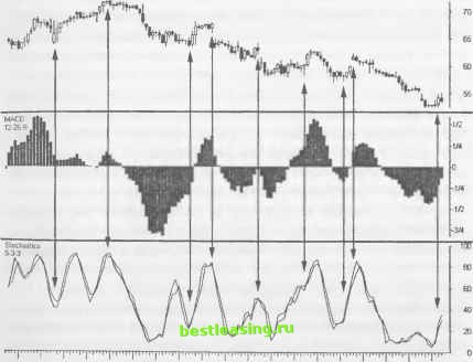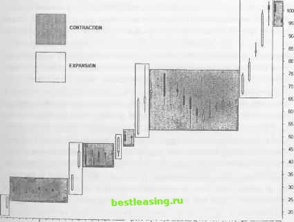 дают возможность существенно сократить убытки перед тем, как позицию выбросит в противоположном направлении. В большинстве случаев закрытие позиции планируйте на момент, когда расширяющийся ценовой бар достигает уровня поддержки/сопротивления. Эта стратегия следует старой мудрости, гласящей: входите в рынок в спокойные периоды времени, а выходите - во времена беспокойные . Следует также закрывать позиции, когда расширяющийся ценовой бар существенно отклоняется от текущего движения, но не достигает точек прорыва уровней S/R. Чаще всего в такие моменты происходит покрытие коротких продаж, прекращается быстрое движение цены в более коротких диапазонах времени и контртренд достигает своей кульминации. Свинг-трейдеры предпочитают открывать позиции на импульсах, предопределяющих единственно возможное направление движения цены, за исключением возникновения благоприятных условий высокой вероятности успеха, требующих большей гибкости в действиях трейдера. Когда импульс проявляется в нескольких временных измерениях и позиции уже показывают прибыль, старайтесь улавливать серию расширяющихся ценовых баров. Но не забывайте, что обычно длительность тенденции составляет около 15-20% всего времени. Давайте предпочтение подаркам , получаемым от нескольких ценовых баров, и переходите к подготовке следующего трейда. Только полученный с годами опыт позволит стабильно отбирать правильную стратегию для каждого отдельно взятого трейда. Научитесь находить благоприятные условия для трейдинга в трех временных измерениях, и вы сделаете гигантский шаг вперед к постижению мудрости торгового процесса. ИНДИКАТОРЫ ОПЕРЕЖЕНИЯ/ЗАПАЗДЫВАНИЯ Большинство технических индикаторов настроено на данные цена/объем. Колебания этих данных также генерируют полярность графиков в производных математических вычислениях. Вот почему свинг-трейдеры не ставят перед собой задачу поиска идеальных индикаторов. Неугомонная рыночная толпа приводит в действие механизм изменения цены, а математике достается всего лишь интерпретация участия толпы в этом процессе. Глаз улавливает наметившуюся тенденцию задолго до того, как некие данные РИСУНОК 2.14 На всех рынках наблюдается бесконечная череда сжатий и расширений ценовых баров. В зоне застоя обычно скапливается гораздо больше ценовых баров, нежели в трендовых движениях. Это еще раз подтверждает тот факт, что заработать деньги на рынке порой бывает очень трудно. Тенденция может уже завершиться к моменту, когда большинство участников рынка заметят сильное ралли или падение цен. В конце концов риск может резко возрасти, если возросшая цена начнет разворачиваться или образовывать новую зону застоя. Свинг-трейдеры стараются открывать позиции с минимальным риском потерь непосредственно перед расширением ценовых баров, когда только возможно, в расчете на то, что неистовая рыночная толпа быстро приведет позицию к прибыли. Daily (Right) EBAY - EBAY INC Bat ![]() 11.......I 1.........ill . N34 5 6 9 10 11 121316 17 16 19 20 23 24 25 27 30 D2347B91011 14 15 16 17 IB 21 22 23 24 RealTick® ©1986-2000. Все права защищены Используется с разрешения Townsend Analytics, Ltd. подают сигналы о ее наличии. Именно поэтому пользуйтесь индикаторами для подтверждения ценовых моделей и ни для каких иных целей. Применяйте популярные ценовые индикаторы для подтверждения полярности графиков, либо опережающей, либ