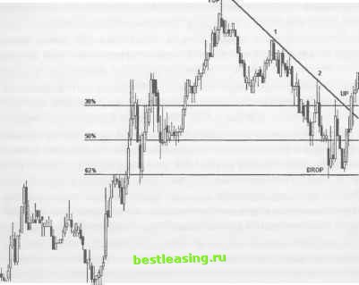 не вникая во всю волновую теорию Эллиотта (Elliott Wave Theory), потому что она способна обуздать страх эмоциональной рыночной толпы. Пятиволновая модель 5WD состоит из трех импульсных волн основной тенденции и двух корректирующих волн, аналогично волновой модели восходящей тенденции. Волны основной тенденции этой сложной модели опускаются все ниже между волнами контртренда. Средняя волна, как и в случае восходящего тренда, самая динамичная и в ней часто наблюдается разрыв, продолжающий медвежью тенденцию. Последний импульс может отражать параболическое движение, вызванное нарастанием страха в настроениях толпы. После этого падения сразу может возобновиться восходящий тренд. Но чаще всего цена формирует Двойное Дно или другую простую модель, которая подготовит хороший базис для прорыва трендовой линии снизу вверх. Первый импульс (ТОР) корректирует восходящий тренд, который уводит ценовой бар к новому максимуму. Здесь часто происходит первый неудавшийся разворот. Первый импульс также инициирует падение цены, завершающееся техническим прорывом акции в третьей волне (1). Во время этой промежуточной коррекции объемы резко возрастают, так как держатели акций понимают угрожающий характер ситуации. Но самое худшее еще впереди -на последнем этапе ценового падения. При формировании третьей волны образуется ложное дно, создающее благоприятную картину для замедления процесса продаж и увеличения открытых длинных позиций. Затем падение возобновляется и даже усиливается внутри пятой эмоциональной волны (2), которая разрушает широко известные цели и зоны поддержки. Важно, что вершина четвертой волны может коснуться дна второй волны модели 5WD. И тогда рушатся общие правила EWT в случае, если происходит это не во время падения, а во время ралли. Паника толпы пятой волны усиливает давление продавцов, и акции начинают отскакивать. Это быстрое движение вверх сжимает короткие позиции и разжигает первый импульс потенциального восходящего тренда. Сильное ралли быстро затухает. И хотя боль владельцев длинных позиций нарастает, неожиданно предыдущее дно удерживается. Новая толпа замечает поддержку и держится за нее. В процессе формирования Двойного Дна цена устремляется снова к трендовой линии 1-2. Баланс сил смещает- ся, и цена, прорывая трендовую линию, начинает двигаться в новой восходящей тенденции. Прогнозируя эволюцию ценового движения, ориентируйтесь на противопоставление нисходящей и восходящей тенденций. Начните с анализа уровней разворотов Фибоначчи и соразмерьте силы ценового падения и предшествующих трендов. Одна простая структура 5WD вызывает первую 38%-ую волну, вторую - 50%-ую, и третий импульс вызывает 62%-ую волну большего восходящего тренда. Это говорит о том, что цена окончательно вернется, чтобы протестировать уровень максимума, откуда и начиналась рассматриваемая нисходящая тенденция. Но, если модель откорректирует 100% или более основного ралли, значительный отскок может быть очень слабым и акция может в конечном счете пойти вниз. В такой ситуации, вероятнее всего, цена прорвет трендовую линию вниз, затем сделает короткую передышку и уже после этого упадет ниже следующего уровня поддержки. Торгуйте с осторожностью и используйте разбросы ценовых колебаний. А когда цена достигнет дна, готовясь к прорыву, быстро меняйте торговы