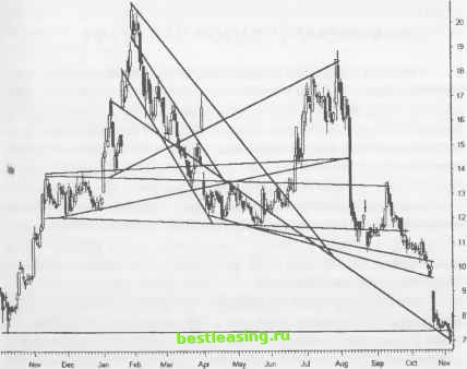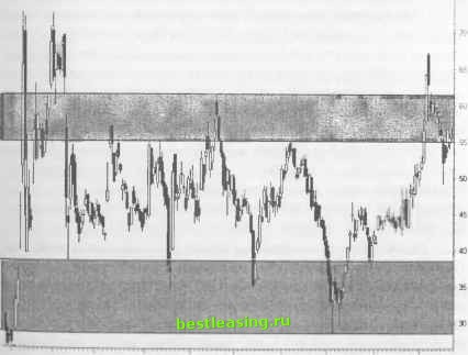 уровни поддержки/сопротивления, то здесь можно найти прекрасные установочные наборы для открытия позиций. Живучесть предыдущих уровней увеличивает шансы на то, что постепенно исчезнут границы зоны застоя. Есть один быстрый способ определить потенциальную прочность ценового диапазона - нужно пересчитать количество отдельных колебаний цены в прошлом. Чем больше их число, тем дольше будет работать fade-стратегия - до тех пор, пока цена не выйдет за пределы зоны застоя. Отображение тенденции также позволяет обнаружить, в каком направлении колебания несут большие прибыли или больший риск. Однако, для большей уверенности, найдите и другие характеристики графика, которые дадут Вам более ранний сигнал о ценовом прорыве этих прибыльных зон. Отображение тенденции можно рассматривать с точки зрения различных уровней поддержки/сопротивления. Тенденции формируются из многочисленных мелких зон расходящейся активности. Восходящие и нисходящие зоны тенденции (trendlets) могут одновременно содействовать движению цены. И обычные трендовые линии, и каналы не могут в полной мере содержать эти добавочные импульсы. На протяжении месяцев или даже лет трендовые участки (trendlets) будут периодически исчезать и появятся вновь именно тогда, когда все решат, что они уже давно не существуют. Движение цены в прошлом оказывает сильное влияние на текущую ценовую активность. Но ни в коем случае не надо думать, что каждый импульс прекратится именно в том месте, где это произошло год или два назад. Ведь тренд формируется под влиянием совокупности различных силовых импульсов. И свинг-трейдеры способны выделить влияние старых импульсов на текущую цену и принять правильное решение в отношение того, где произойдет главный разворот. Еще раз пересмотрите тенденцию и оцените различные элементы, оказывающие влияние на состояние рынка. Сфокусируйте свое пристальное внимание на начальной стадии основного ценового движения и пересмотрите его, бар за баром, до того момента, пока на графике не проявится эмоциональное состояние толпы. Еще лучше, исследуйте движение цены в прошлом посредством графической программы. Установите график так, чтобы начало исследуемого ценового движения пришлось на правую кромку страницы монитора, и затем, перемещая каждый очередной ценовой бар, шаг за шагом изучите это движение. Вы найдете, что каждая тенденция имеет свой индивидуальный характер и эмоциональную природу. Именно этим нужно руководствоваться при объяснении того, как взаимодействие алчности и страха инициирует перелом в состоянии рынка в важных точках разворота. Изучайте историю отображения рынка в контексте основополагающих эмоций толпы. И перед Вами в какой-то момент проявятся новые благоприятные возможности для прибыльной торговли. ЗОНА СВЕЖЕГО ВОЗДУХА (CLEAR AIR) Прибыль зависит от взаимосвязи цены и времени. Когда цена проходит наибольшее расстояние за наименьший промежуток времени, ценовой бар или свеча растягиваются в длину. Это явление указывает на то, что в этих точках проявляются прекрасные благоприятные возможности для прибыльного трейдинга. Свинг-трейдеры используют данный сигнал о растяжении для открытия новых позиций. На ценовом графике можно обнаружить многочисленные участки так называемого тонкого рынка с ограниченным числом его участников, хотя объе