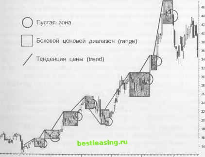 мудрости технического анализа, гласящей: используй математические индикаторы только для подтверждения ценовых моделей, и не более того. Волатильность акций представляет собой сырье для генерирования импульса. Эта иллюзорная концепция приоткрывает дверь к успешному трейдингу, так вот найдите время и не пожалейте его для четкого понимания того, как эта концепция работает. В журнале Технический Анализ Акций и Товаров волатильность определяется как коэффициент тенденции роста и падения цены акции, рассчитываемый по дневной истории изменения цены за последние 12 месяцев . Поскольку данное определение относится к определенному периоду времени, оно наглядно иллюстрирует, как относительные колебания цен обнаруживают уникальный характер движения рынка. Индикатор скорости изменения (ROC) определяется как коэффициент тенденции цены в зависимости от времени. В принципе, волатильность изучает то же самое, но уже изначально в уравнении устраняется направление. При этом волны, которые описывает цена, вытягиваются в прямую линию (выравнивается), и затем рассчитывается их длина (длина этой прямой). Понятно, что более волатильные рынки проходят большие дистанции, нежели менее волатильные за один и тот же период времени. Но этот внутренний механизм представляет ценности для свинг-трейдеров до тех пор, пока с его помощью не будут зафиксированы прибыли. К счастью, волатильность обладает очень важным свойством, помогающим в предварительном анализе рынка. Она имеет тенденцию к движению в регулярных, легко опознаваемых циклах. В то время как цены откатывают и накатывают , волатильность колеблется между активным и неактивным состояниями. Применяя оригинальную технику свинг-трейдеры, могут определять этот феномен как на рынке акций, так и фьючерсном рынке. Так, например, 10- и 100-периодная историческая волатильность изучает взаимосвязь между размахом ценового цикла и текущим движением цены. В своем классическом труде Дэй-трейдинг с Применением Краткосрочных Ценовых Моделей и Прорыва Открытого Диапазона Тони Крэбл (Tony Crabel) прогнозирует волатильность при расширении и сужении ценовых моделей. Исторические графики цен выявили циклическую смену сужающихся диапазонов и направленных трендов. Застой отражает негативную энергетическую реакцию, вызывающую движение цены между хорошо очерченными границами, но не обозначает определенного направления. Сильный рост или, наоборот, сильное падение цены отражает позитивную энергетическую реакцию, способную вызвать направленное движение. Прорыв застойной зоны смещает силу рынка от негатива в сторону позитивной реакции. Кульминационные новости способны негативную энергетику рынка обратить в позитивную реакцию. В результате любого рода реакции рынка резко возрастают возможности получения прибылей. Рост волатильности при направленном ценовом движении генерирует мощную силу, которая пробуждает позитивную реакцию, в результате которой ценовые бары выйдут за пределы зоны застоя. Толпа замечает появление новых, динамичных условий, и количество участников рынка начинает расти, что, в свою очередь, вызывает еще большее изменение цены. Этот динамичный механизм подпитывает сам себя вплоть до определенного кульминационного момента, и тогда цена разворачивается, и образуется новая зона застоя. Трен