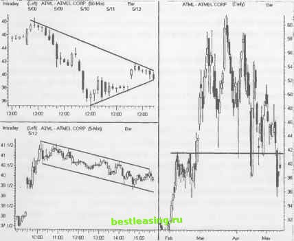 В определенные промежутки времени в течение дня, недели или месяца рынок демонстрирует определенные черты, способные увеличить или уменьшить шансы на получение прибыли. Волатильность первого часа торговой сессии рыночные инсайдеры используют для опустошения карманов, не боясь сливаться с четкой тенденцией. Неделя, в конце которой истекает срок действия опционов, как правило, характеризуется слабым рынком, в основном пребывающем в боковом диапазоне. На тонком предпраздничном рынке часто развиваются драматические события со взлетом или сильным падением курсов совершенно неожиданных акций. Нередко выходящие по пятницам правительственные статистические данные разжигают рынок в утреннюю сессию и вызывают сильные направленные движения в обширной части рыночного пространства. Над каждой отдельно взятой благоприятной возможностью заработать нависает тень момента времени. Очень важно научиться фокусировать свое внимание на реакции биржевой толпы именно в тот момент, когда вышедшая новая информация начнет влиять на характер рынка. Такая информация может позволить открыть позицию всего на несколько минут, а может и не нести информации о том, когда и как успешно завершится сделка. Поэтому очень важно научиться определять влияние времени на соотношение вознаграждениегриски (reward:risk) до открытия позиции и корректировать свои действия в зависимости от появляющегося на экране каждого очередного ценового бара. Свинг-трейдеры должны управлять временем также эффективно, как и ценой. Расчет ожидаемого периода времени на каждую новую позицию проводится в зависимости от расстояния до следующей зоны высокого риска. Расчет ограничения убытков (stop loss) обязателен с учетом и цены, и времени. Очень важно вовремя закрывать позиции, реально не приносящие доходов, даже, если цена не достигла просчитанного уровня stop loss. Осуществляйте торговые сделки только тогда, когда время указывает на назревший момент для открытия прибыльной позиции, и не бойтесь зачастую оставаться в стороне, если таких сигналов нет. Тенденции действуют только в том временном диапазоне, в котором они проявляются. Тренд одного периода времени не дает оснований считать, что на следующем, более коротком диапазоне времени также будет наблюдаться направленное изменение цены до тех пор, пока не произойдет пересечения ключевых уровней более короткого и длительного временных периодов. Модели Циклов, наблюдаемые на графиках с периодом времени, большим или меньшим того, на котором рассматривается текущий тренд, независимы друг от друга и демонстрируют свои собственные тренды и боковые диапазоны. Такая взаимосвязь наблюдается на всех ценовых графиках: от минутных до годовых. Свинг-трейдеры должны оперировать трендовой относительностью в рамках метода Трех Дней (3D). Большинство прибыльных позиций выстраивается на нахождении уровней поддержки-сопротивления на графиках большего диапазона времени и на определении точки входа в рынок с минимальным риском потерь на графиках меньшего периода времени. Однако на этом относительность тенденции не исчерпывается. На рынке постоянно происходит изменение цен, которое и лежит в основе конфликта рыночных быков и медведей. И если текущая тенденция нечетко проявляется на том или ином графике, анализ будущей позиции может быть с