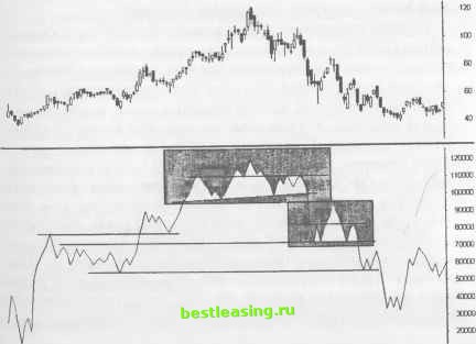 БАЛАНСОВЫЙ ОБЪЕМ (ИНДИКАТОР OBV) Балансовый объем, или индикатор OBV, разработанный Джозефом Грэнвиллом (Joseph Granville), представляет собой один из популярнейших методов изучения накопления/распределения в мире трейдинга. Этот простейший индикатор распределяет дневной объем по закрытию каждого дня. Когда цена закрытия акции выше цены закрытия предыдущего дня, к OBV прибавляется дневной объем. Если цена закрытия акции оказалась ниже цены закрытия предыдущего дня, то дневной объем вычитается из показателя. С течением времени индикатор выстраивает комплексную картину настроя рыночных покупателей и продавцов. Индикатор OBV характеризует ценовые модели, подобно ценовым барам. Данный индикатор дает возможность исследовать ценовой график посредством таких технических инструментов, как трендовые линии, модели Треугольники и Двойное Дно . Свинг-трейдеры должны проводить сравнительный анализ этих моделей с ведущими ценовыми моделями и проводить предварительный прогноз схождений/расхождений. Часто индикатор OBV опережает цену и завершает важный разворот, как раз перед движением тенденции. Ограничьте изучение всего накопления/распределения дневными графиками. Внутридневные временные рамки искажают объемные показатели. Более 60% от всего дневного торгового объема приходится на 30% продолжительности торгового дня. Это не дает возможности сделать соответствующее дествительности сопоставление внутридневных ценовых баров и объема. Больше ориентируйтесь на гистограммы объема, чем на комплексные расчеты на протяжении всей торговой сессии. При интерпретации влияния объема на краткосрочные тенденции опирайтесь на время и объемы продаж. РИСУНОК 5.25 На графике акции Citrix Systems отчетливо прослеживаются несколько моделей разворота Голова и Плечи , которые нарисовал индикатор OBV при снижении цены акции. Проанализируйте, как индикатор демонстрирует классический откат и как он реагирует на горизонтальный уровень поддержки/сопротивления в зоне застоя. Балансовый объем часто опережает цену несколькими барами. Используйте это свойство для определения спроса и предложения при стремлении цены достичь нового максимума или минимума. Daily (Right) CTXS CITRIX SYSTEMS Bar OBV 2000 ![]() 10000 .......I.........................................I....................................... ..................1.................... Dec Jan Feb Mar Apr May RealTick® ©1986-2000. Все права защищены Используется с разрешения Townsend Analytics, Ltd. Каждый раз, при достижении ценой нового максимума или минимума, сверяйтесь с индикатором OBV или другим индикатором накопления/распределения, которые в указанных зонах имеют мощную силу прогнозирования. Изучая балансовый объем, Вы можете столкнуться с двумя уникальными ситуациями. Либо индикатор OBV раньше цены начнет бомбардировать новый уровень, либо, наоборот, цена раньше достигнет новых границ. Следуйте известной заповеди, согласно которой цена нуждается в поддержке ТЕХНИЧЕСКИЕ ИНСТРУМЕНТЫ ОБЪЕМА Технические инструменты объема снабжают важной информацией, необходимой для выявления основных ценовых разворотов. Объемы также дают четкие сигналы на надвигающиеся ценовые прорывы вверх или вниз, когда они опережают построение ценовых графиков. толпы для дальнейшего продвижения вверх, упасть же вниз она способна под собственной тяжестью. Если индикатор OBV достигнет нового максимума до цены, ищите растущие ценовые бары. Если 