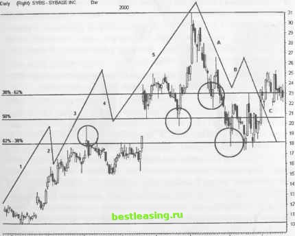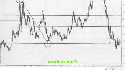 Jan Feb Mar Afr May Jun RealTick® ©1986-2000. Все права защищены. Используется с разрешения Townsend Analytics, Ltd. и ее применения в следующем столетии. И еще многие десятилетия наши внуки будут наблюдать за тем, как применение чисел Фибоначчи будет революционизировать их понимание взаимодействующими друг с другом правым и левым полушариями головного мозга. РИСУНОК 5.27 Примените силовую последовательность Фибоначчи для выявления максимумов или минимумов, к которым может устремиться цена акции COVD. Часто тенденция растягивается на 38% выше расстояния между последним максимумом или минимумом и откатом, прежде чем цена предпримет прорыв вверх или вниз. Найдите на графике Двойное Дно или Двойную Вершину в пределах зоны застоя и растяните сетку Фибоначчи от этой точки до последнего уровня максимума или минимума. Затем подключите инструменты Вашего программного обеспечения с тем, чтобы провести линию, отстоящую на 38% выше данного уровня для обнаружения данной цели. Daily (Right) COVD COVAD COMMON CATIONS GRP 1999
