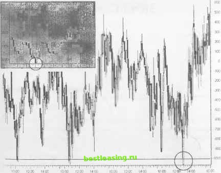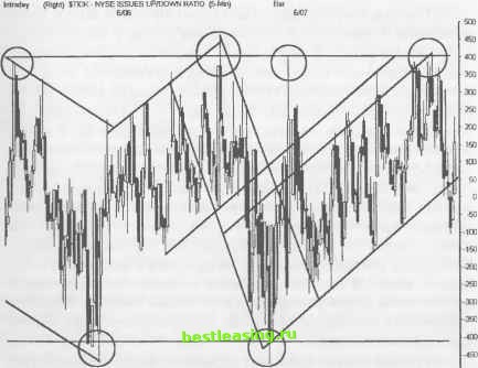 РИСУНОК 5.32 В начале июня график NYSE TICK нарисовал типичную для 5-минутного графика модель. За 3 дня график нарисовал, как минимум, четыре четких параллельных канала и гармонические линии. Такие легко опознаваемые зоны позволяют выявить как развороты цены, так и ее прорывы в течение каждой торговой сессии. Отметьте для себя, каким образом тени свечей выходят за пределы зоны, ограниченной между отметками +400 и -400. Горизонтальный уровень сопротивления определяет кульминацию покупок или продаж, которое может длится несколько дней. ![]() .......................... ..... ................ 1 П ..... 1 Ч .......... 1 ...............I........... 2 00 13 00 14 00 15 00 10 00 11 00 12 00 13 00 14.00 15 00 10 00 11 00 12 00 13:00 14 00 15 00 RealTick® ©1986-2000. Все права защищены. Используется с разрешения Townsend Analytics, Ltd. 1000. Эти границы для состояния перекупленности/перепроданности рынка существуют годами. Однако современный рынок приобрел еще более волатильный характер, чем рынок прошлых лет. Сейчас колебания тиков происходят в диапазоне от +1500 до -1500. Свинг-трейдеры могут опять-таки использовать все уже известные старые ограничения при ожидании разворота рынка. РИСУНОК 5.33 По мере того, как индикатор дает сигнал на завершение глубокой коррекции, тик пытается периодически пробивать уровень -1000. Третий удар несет ответственность за 6-месячный уровень low, которого достиг индекс Nasdaq перед началом нового ралли. К сожалению, современный рынок не всегда реагирует на такие классические точки разворота. Последняя коррекция отослала индикатор к уровню -1500, и только потом произошел серьезный разворот цены. Всегда ищите нескольких тестирований экстремальных значений тиков для подтверждения смещения настроя толпы в сторону покупателей, либо в сторону продавцов. ilisday (R19MS STICK NYSE ISSUES UPTOWN RATIO (SMm) Bai 5Л9 502 S/23 5/24 SO! ![]() RealTick® ©1986-2000. Все права защищены. Используется с разрешения Townsend Analytics, Ltd. И всегда пытайтесь найти подтверждения пересечением в графических моделях индексов, если пытаетесь идентифицировать разворот цены в более долгосрочных временных диапазонах. ГЛАВА ВРЕМЯ НА ОСМЫСЛЕНИЕ ЭЛЕМЕНТ ВРЕМЕНИ Ценовые модели выявляют благоприятные возможности для трейдинга. Однако очень важно понять, что неверное управление временем позиции может не просто ослабить выбранную тактику работы, но и опустошить торговые счета. И к сожалению, не каждый участник рынка способен постичь этот крайне важный факт. Каждый многообещающий установочный набор рассчитан на оптимальный период удержания позиции, при котором соотношение доходность/риск достигает максимального значения. Данный период удержания позиции может не соответствовать временным рамкам, установленным в Вашем торговом плане. Тем не менее, либо позиция и торговый план должны быть синхронизированы, либо результаты трейда могут быть совершенно неудовлетворительными. К сожалению, многие участники торгов игнорируют факт синхронизации времени и вскакивают в рынок, когда им заблагорассудится. По принципу управления временем можно разделить успешно работающих трейдеров от неудачливых, терпящих убытки. Ленивые участники рынка, игнорируя фактор времени, не способны корректно интерпретировать получаемые сигналы и все доступные ресурсы. Время оказывает влияние на два важных характерных свойства ценового графика. Во-первых, время определяет, каким образом следует выстраивать управление позицией в зав