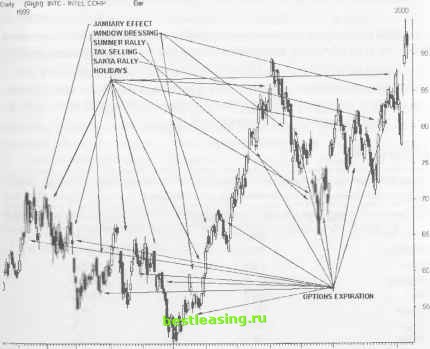 ми, слишком опасно. Лучше зарабатывайте деньги на интерпретации графических полотен, нежели спекулировать на внешних воздействиях на рынок. По пятницам приходится вступать в схватку с другими достаточно существенными силами, воздействующими на состояние рынка. В пятницу, выпадающую на середину каждого месяца, истекают сроки опционов. Обычно на этой неделе генерируется небывалая волатильность, достигающая пикового своего состояния именно в пятницу - в день истечения сроков опционов. Характер рынка в данный период времени может быть в высшей степени непредсказуем. Свинг-трейдеры могут принять решение удлинить свой weekend и еще раз переосмыслить все трансакции, которые были осуществлены на этой неделе. Большинство участников рынка также использует конец недели для приведения в порядок своего баланса за истекшие четыре дня недели. Многочисленные торговые стратегии, применяемые институционалами, сфокусированы на недельных ценовых барах. Когда неделя близится к завершению, профессиональные приверженцы технического анализа определяют все необходимое для корректировки своих портфолио и предпринимают соответствующие действия, в целях защиты своих крупных торговых позиций. Многие участники торгов к концу недели предпринимают крайне неразумные действия, имея на руках открытые позиции с большими прибылями или убытками. Терпящие убытки трейдеры вскакивают в волатильные акции, стремясь хотя бы нейтрализовать потери, а трейдеры, позиции которых указывают на наличие солидных прибылей, выходят из рынка в тот момент, когда трейд еще не исчерпал свой потенциал. Рынок стремится завершить неделю в устойчивом состоянии, что часто является возбудителем сильных тенденций как в одном, так и в другом направлениях. Однако пятничные тенденции чаще завершаются плачевно, а не приятным возбуждением. Многие игроки к середине дня расслабляются и не возвращаются на торговую площадку до понедельника, особенно в летний период. Это зачастую приводит к прерывистому, нервному характеру рынка с небольшими торговыми объемами. Но если на рынке в пятницу все-таки произошел серьезный конфликт или дисбаланс сил сохраняется, то каждый участник рынка остается у своего терминала до последней минуты торговой сессии. СЕЗОНЫ И СЕЗОННОСТЬ Четко определенное сезонное разнообразие может дать фальшивые благоприятные возможности для трейдинга. Так, например, истечение сроков опционов отражает высокий уровень манипуляций. Правила классических прорывов цены вверх и вниз должны четко выполняться в столь волатильные периоды сессии, с тем чтобы минимизировать риски потерь. Различные периоды месяца или года генерируют определенные специфические отклонения, способные оказать влияние на характер трейдинга. Изучите подобные цикличные перегибы, которым могут подвергнуться открытые Вами позиции. Праздничные и предпраздничные торговые сессии вызывают позитивный настрой рынка, но отличаются повышенным риском потерь. Мартин Цвейг (Martin Zweig) составил каталог механизмов интересных феноменов и описал его в своем классическом труде Как выигрывать на Wall Street ( Winning on Wall Street ). Он отметил, что в праздничные дни американские финансовые рынки завершали сессию на подъеме в 83% случаев за период, начиная с 1952 года и до 1985 года. С тех пор как он опубликовал свои открытия, рыно