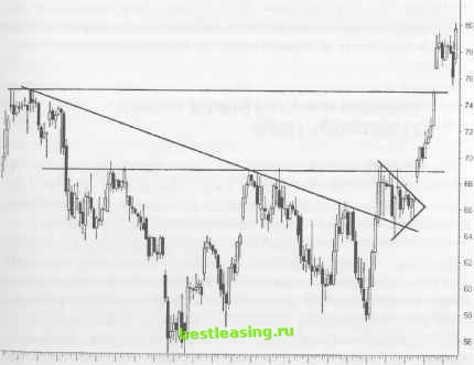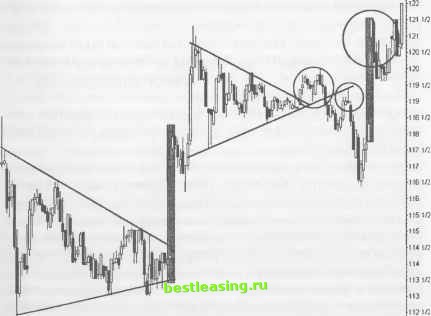 моделям прогнозирования состояния рынка. Установочные наборы, объединенные в так называемые 7-Bells setups , представляют собой следующее поколение надежного рыночного механизма. Эти классические образцы обнаруживают прогнозируемые движущие силы рынка в любых временных рамках и предлагают многообещающие торговые позиции. С их помощью можно выстроить торговые тактики, связывающие известные установочные наборы с широкомасштабным движением рынка. Свинг-трейдеры овладевают управлением невидимых оригинальных установочных наборов. Тщательно исследуйте, как ведут себя Модели Циклов при появлении новых рыночных условий. Ценовые графики рисуют множество различных хорошо известных моделей. Даже простейшие ценовые развороты могут представлять собой различные комплексы мутаций, способных предложить весомые прибыли. Сначала определите, похожа ли данная модель на классическую. Если да, то перечислите потенциальные несоответствия данной модели с господствующей тенденций и механизмом поддержки/сопротивления. Затем исследуйте более долгосрочные формирования для выявления точек прорыва. Продумайте осуществление торговой сделки, когда будет наблюдаться согласованность направления движения с временем и с уровнями прорыва цены. Многие сигналы появляются в массе внутридневных шумов. Но часто эти сигналы бывают ложными и предопределяют лишь хаотические колебания цены. Среди всей подобной дезинформации выявите потенциальные установочные наборы. Определите уровни поддержки/сопротивления, способные остановить движение. Каждый из таких уровней, если цена возвращается к нему, способен возвратить безрассудную толпу к нормальному психологическому состоянию, усмирить энтузиазм или обуревающий ею страх. Оцените последовательность максимальных и минимальных уровней данной модели. Будут ли они сохраняться при сериях подъема или понижения цены? Или конфликт рыночных сил побудит цену пойти в непрогнозируемую территорию? Проверьте внешние факторы воздействия на состояние данного установочного набора. Остерегайтесь позиций, не имеющих поддержки со стороны рынка. Свинг-трейдеры терпят неудачу, если они теряют способность видеть . Трейдеры, хорошо изучившие теоретический материал, зачастую проводят столь жесткий контроль за ценовыми графиками, что порой превосходные установочные наборы теряют РИСУНОК 7.1 Три хорошо сформировавшиеся трендовые линии и Треугольник дали сигнал на 12-пунктовый рост цены акции Xilinx. Эта комплексная модель использует важные элементы, такие как Большое W , пятивол-новое понижение цены, первый подъем и тройное наблюдение. Установочный набор зависит пока только от интерпретации основных трендовых линий и от четкого выбора времени. Оригинальные модели, которые генерируют большую часть визуального конфликта, предлагают колоссальные благоприятные возможности для прибыльного трейдинга. Intraday (Right) XLNX XILINX INC (60-Mm) Bar 4/28 5,02 5Я4 5ЮВ 5/10 5/12 5/16 5/16 5/22 5/24 5/26 ![]() RealTick® ©1986-2000. Все права защищены. Используется с разрешения Townsend Analytics, Ltd. в их глазах свою привлекательность. В современных рыночных условиях крайне редко можно обнаружить идеальные модели и индикаторы. Научитесь осуществлять торговые сделки, разгребая мусорные завалы, которыми порой изобилуют ценовые графики. И наоборот, не гонитесь за каждым пересечением, прин