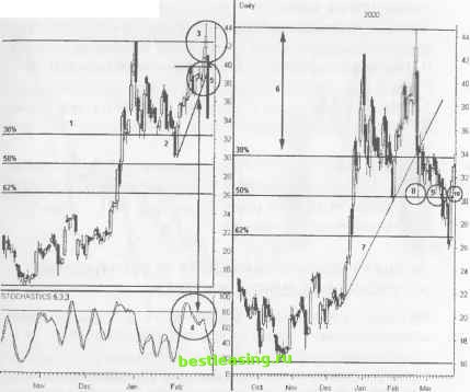 ДВЕ КЛАССИЧЕСКИЕ ПРИКЛАДНЫЕ ЗАДАЧИ Предлагаемые ниже модели представляют собой классические прикладные задачи, предназначенные для трейдинга. Их существование на протяжении ряда лет установили за ними славу прибыльных для многих поколений. Хотя Двойная Вершина (2В top) служит для открытия коротких позиций, она также способна содействовать эффективному трейдингу на дне ценового движения. Помните, что эти задачи пытаются найти безопасное управление риском на уровнях открытия позиций. Не забывайте также, что каждый хороший трейд имеет более одной успешной стратегии. Ниже приведены некоторые примеры, иллюстрирующие несколько вариантов, позволяющих опустошить карманы участников рынка. ДВОЙНАЯ ВЕРШИНА (2В ТОР) Приведенный ниже установочный набор представляет собой одну из разновидностей модели Двойная Вершина , позволяющую раньше других классических моделей при вершине осуществлять открытие торговой позиции. Открывать короткую позицию с минимальным риском потерь можно как только сформируется первый ценовой бар после неудачной попытки преодолеть уровень предыдущего максимума. ОПИСАНИЕ Модель Двойная Вершина (2В top) формируется после неудачной попытки тестирования предьщущего максимума цены. Последующие ралли к этому уровню цены не будут вновь активизировать данный установочный набор, потому что в дальнейшем увеличивается вероятность прорыва данного ценового уровня и продолжение движения цены к уровню нового максимума. Цена должна превысить первый максимум модели, по крайней мере, на один ценовой бар, прежде чем опустится ниже данного уровня. РИСУНОК 7.3 Многодневные установочные наборы улучшают результат позиции, когда они осуществляются в специфические внутридневные периоды времени. Представленный на графике трехдневный ценовой канал акции Qualcomm указывает на надвигающийся ценовой прорыв непосредственно перед закрытием торговой сессии. Открытие позиции в последний торговый час с последующим ее закрытием на следующее утро может обеспечить внушительную прибыль, так как волатильность при открытии утренней сессии обеспечит расширяющееся движение рынка. Используйте знания о рыночных часах для более точного регулирования установочным набором при принятии решения открыть торговую позицию. Hiaday (Right) QCOM - QUALCOMM INC (5 Mm) 6/05 6/06 ![]() i.....I...........i 10 00 ........Г1 ! 14 00 .....)........... l l lp ...... l 10 00 12 00 ...................1.....1.....Г 10 00 I1 UIIIM I II..... l 12 00 t4O0 I......... I 10 00 RealTick® ©1986-2000. Все права защищены. Используется с разрешения Townsend Analytics, Ltd. Подъем цены ко второй вершине модели будет представлен большим количеством ценовых баров, чем подъем цены к первому максимуму. При тестировании максимума тень свечи должна быть выше последнего high, а тело свечи - ниже этого уровня. При этом может образоваться модель падающая звезда или дожи . При наблюдении за ростом цены при тестировании максимума, активизируйте в нижнем окне графического полотна осциллятор. Перед тем, как цена подойдет ко второй вершине, индикатор развернется и начнет двигаться прочь из состояния перекупленности. Применяйте идентичные правила при применении установочных наборов, когда цена нарисует модель Двойного Дна (2В bottom) при тестировании нового минимума. Открытие свинг-позиции после неудавшейся первой попытки тестирования максимума, зависит от модели при вершине. Никогда не ждите немедленног